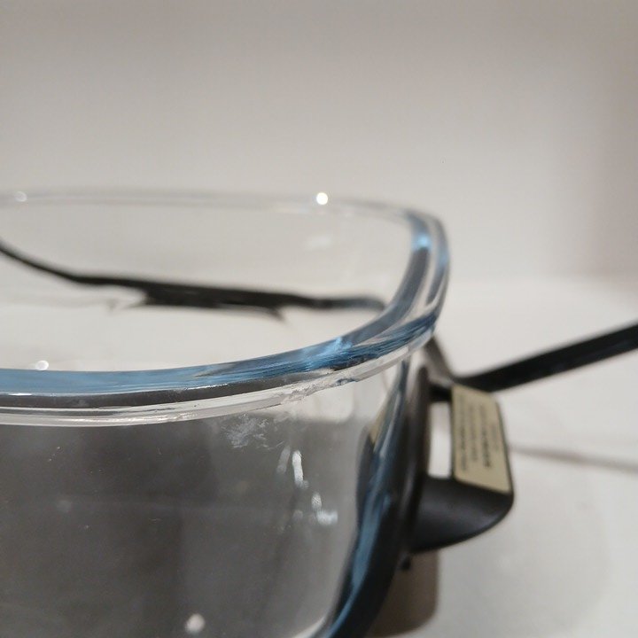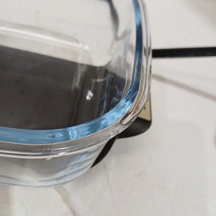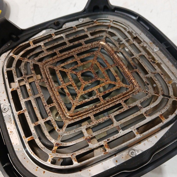 SMALL chip in the side of the small glass missing the larger glass there is some cooked on grease and grime on the grate of the top tested for power
