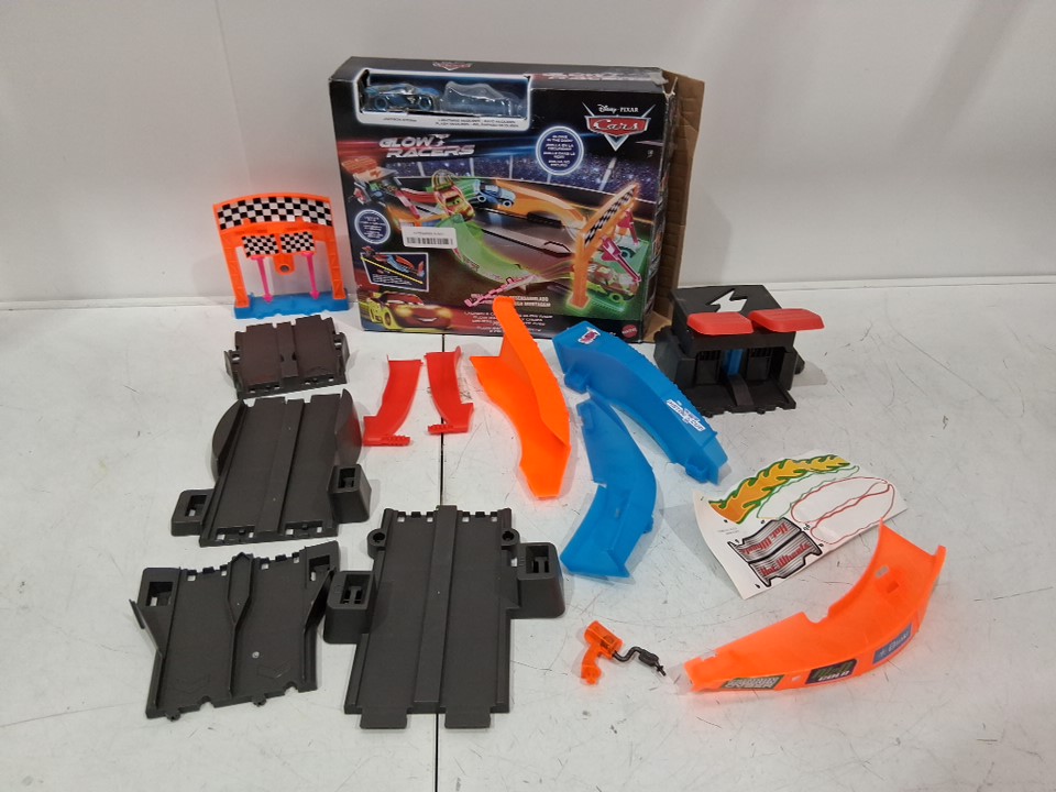 please note the item is missing lightning mcqueen. there are cosmetic scratches and some of the stickers have already been placed. see photos.