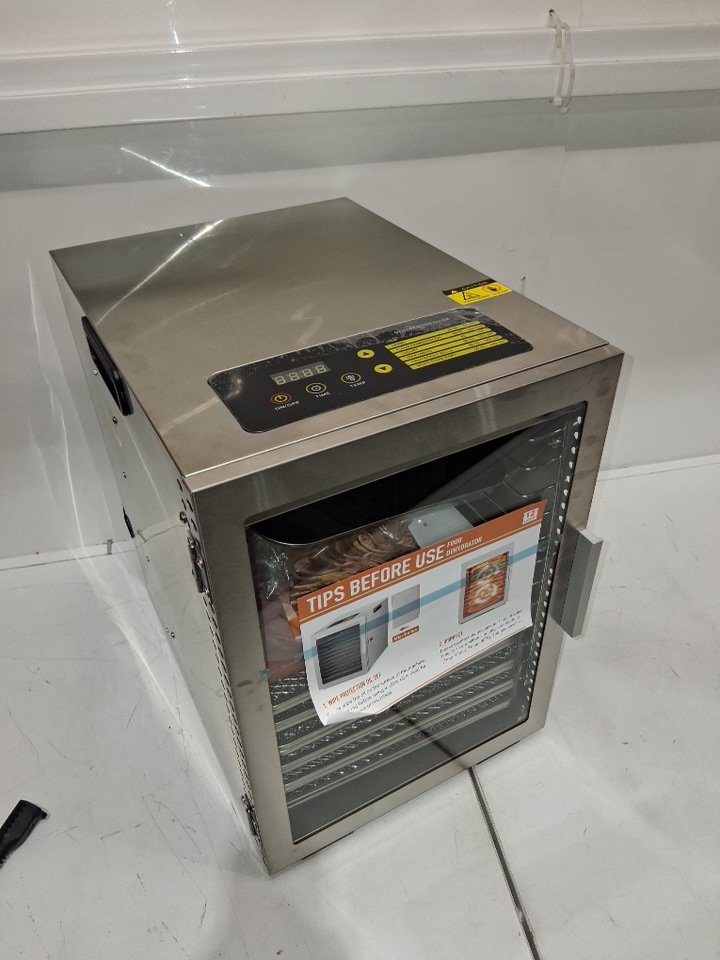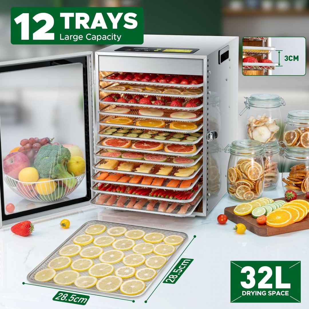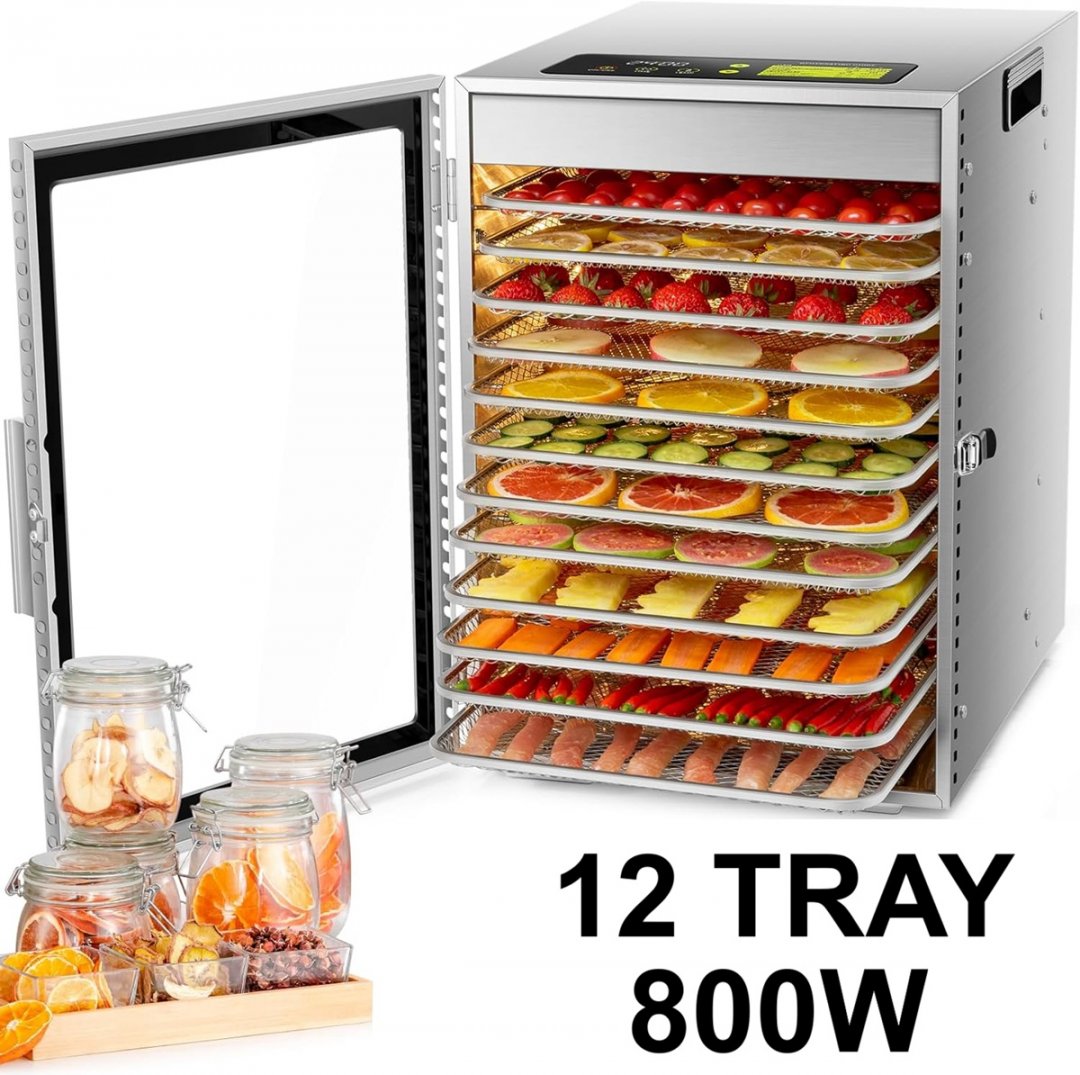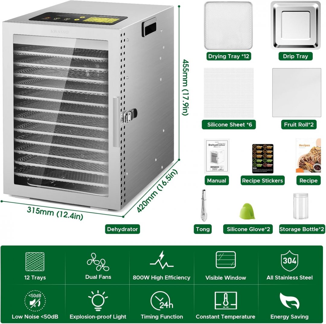 kwasyo 12 tray food dehydrator machine - 11" x 11" trays, 800W - stainless steel - (model: lt-22)