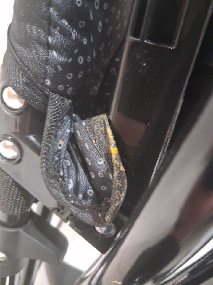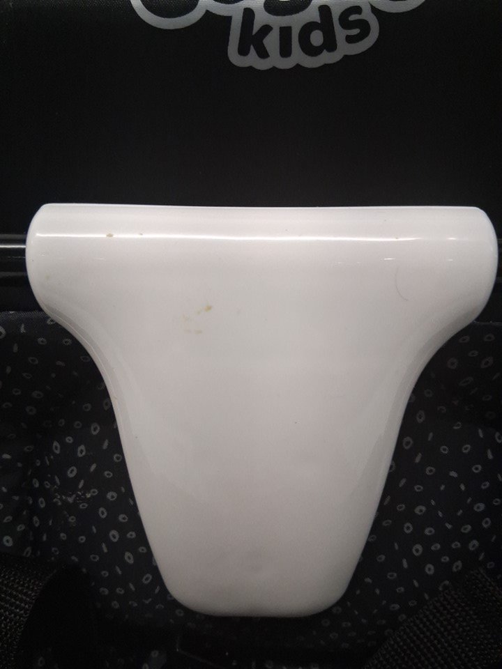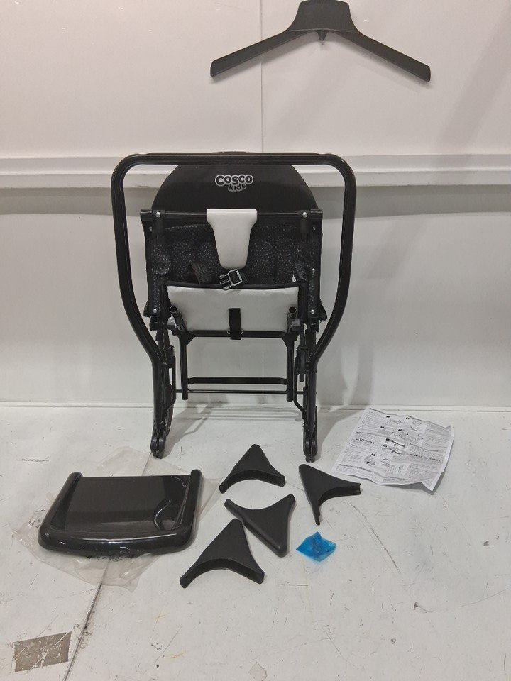 chair is missing white tray, tray is replaceable. Item has some food residue on seat fabric and white plastic piece, feet and tray have markings ( see photos)