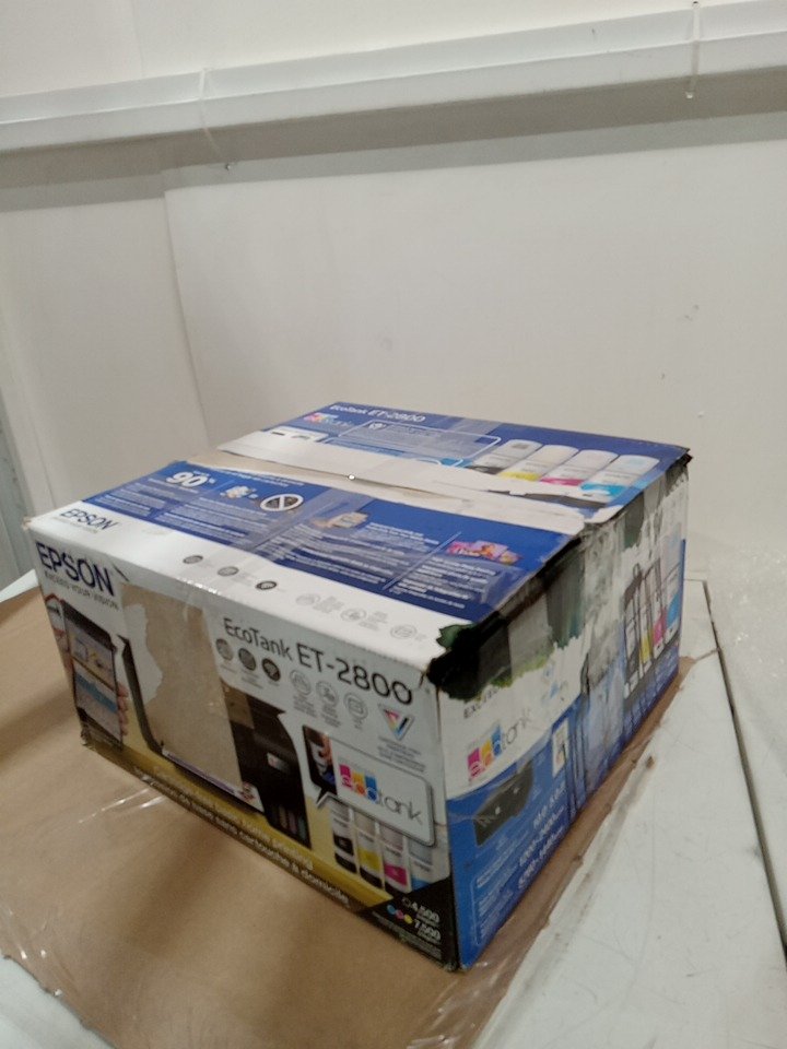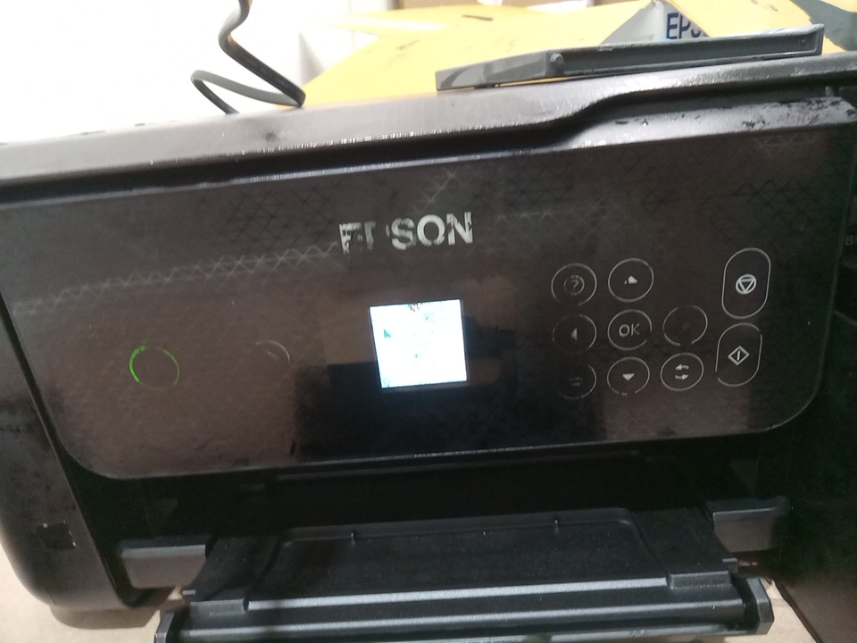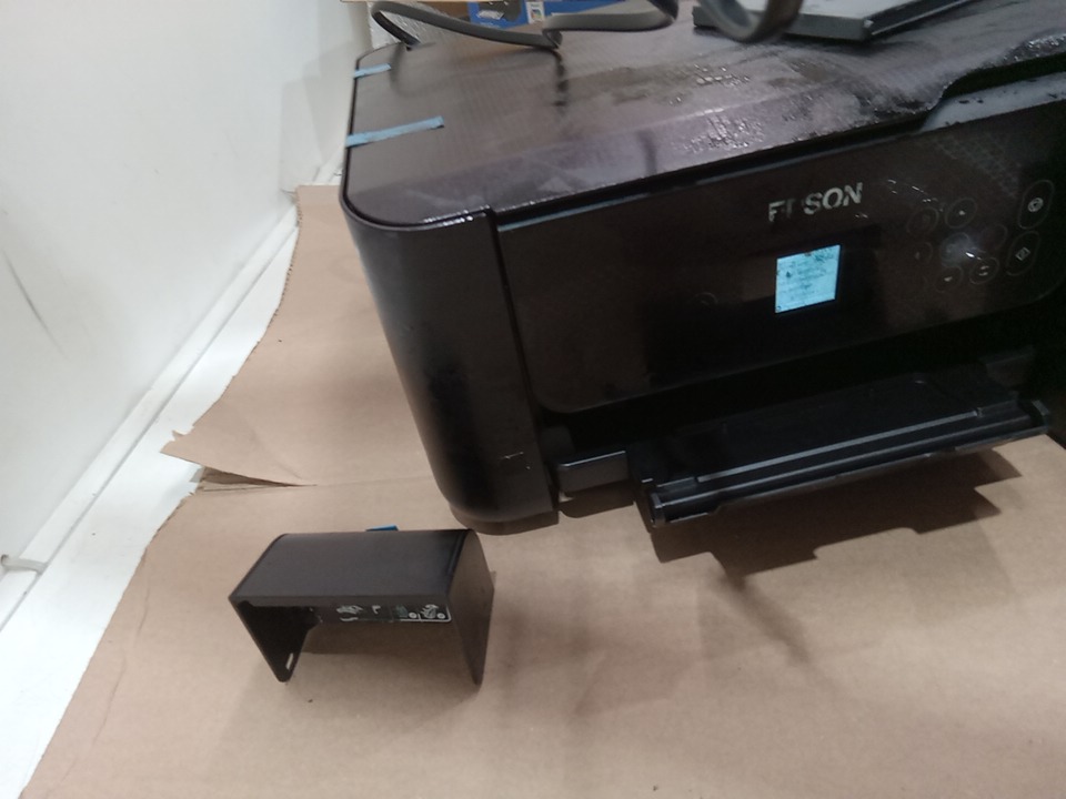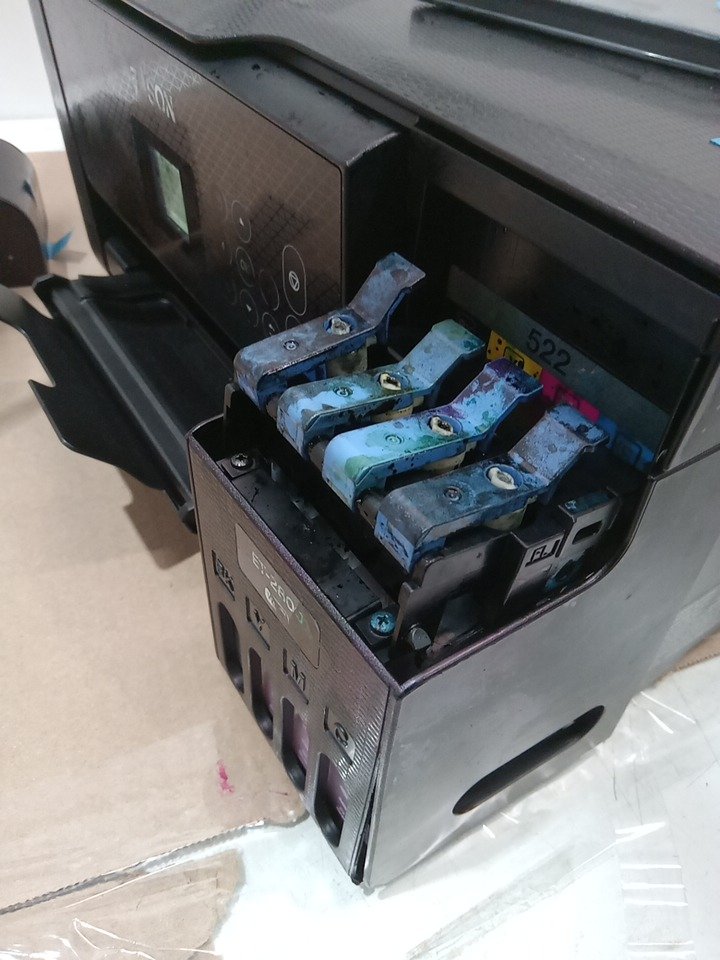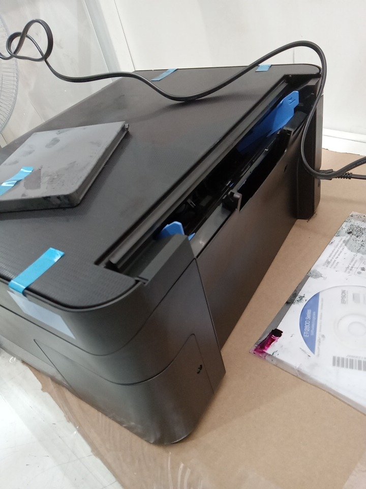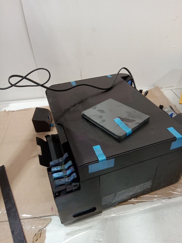 It looks like the ink cover came/broke off and the ink exploded in the box and covered the printer, unsure how/if this affect function. Tested for power only.
