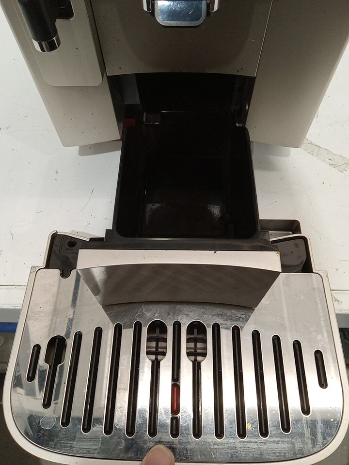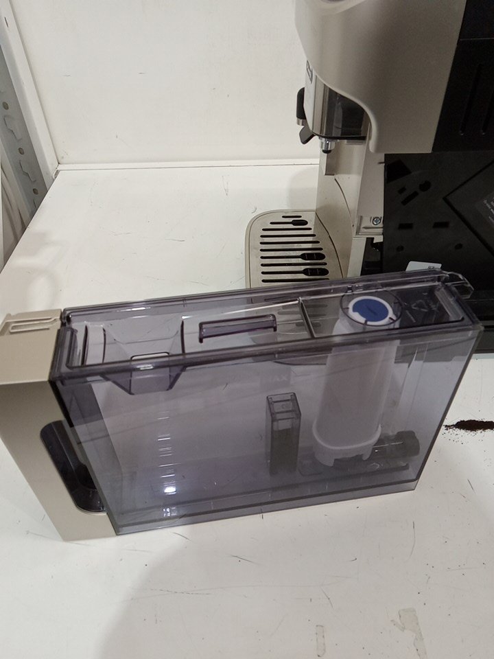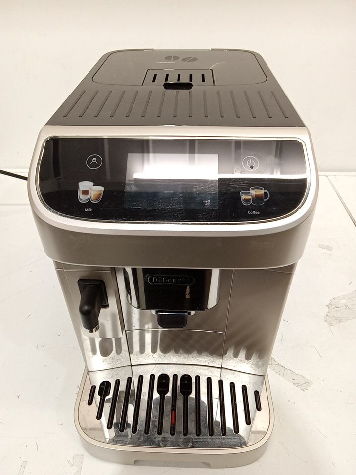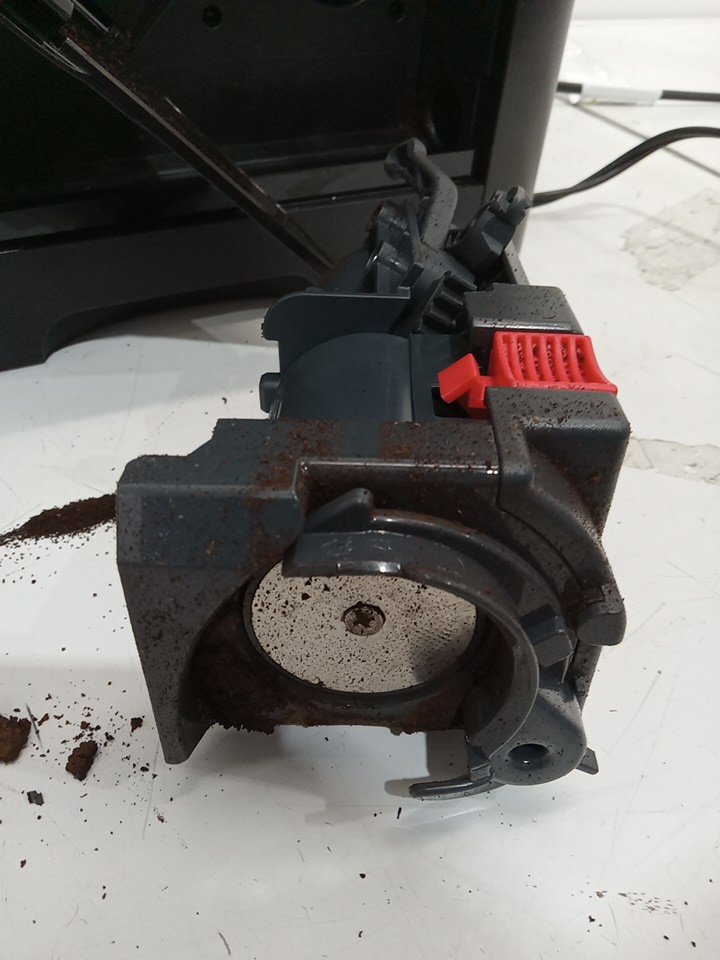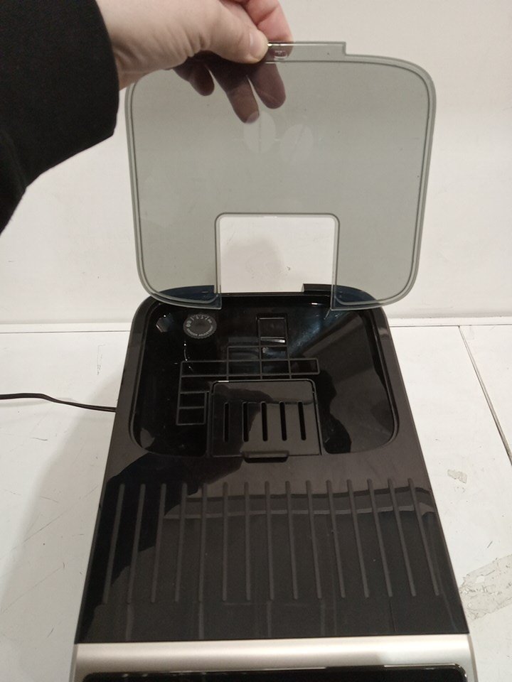 Coffee/water residue present as a result from previous use. Item tested for power only. Unable to fully test item due to it's nature. Item is missing the frother cup. Also item is marked with issue as part of the plastic housing has been pulled apart. See attached photos.