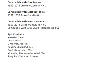 Compatible with: 1992-2011 Crown Victoria V8 4.6L 1991-1997 Town Car V8 4.6L 1992-2011 Grand Marquis V8 4.6L 2003-2004 Marauder V8 4.6L