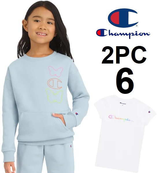 2PC Girl's Champion LONG SLEEVE CREWNECK sweatshirt and short sleeve tee shirt - 6 - Light Blue / white (STYLE: 1114545)