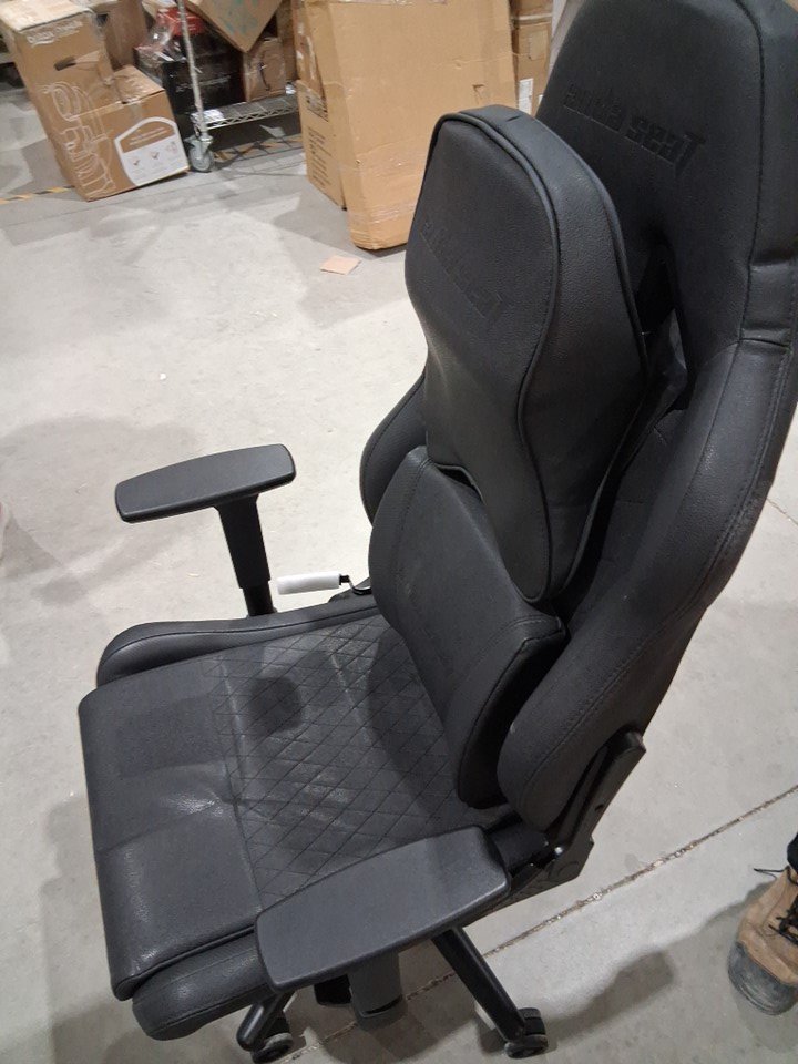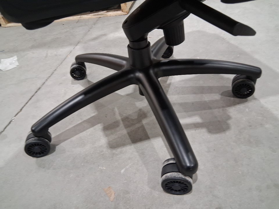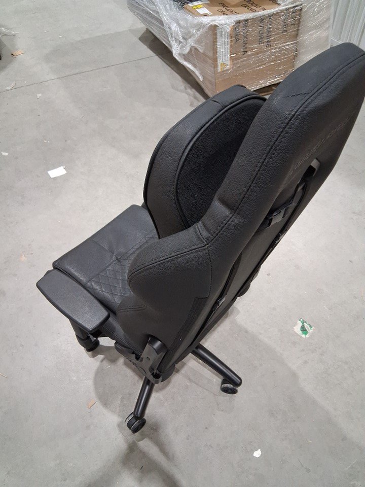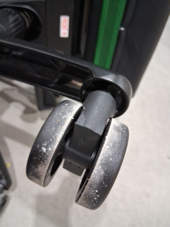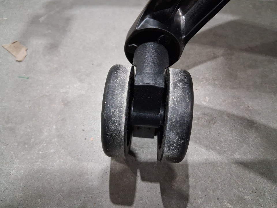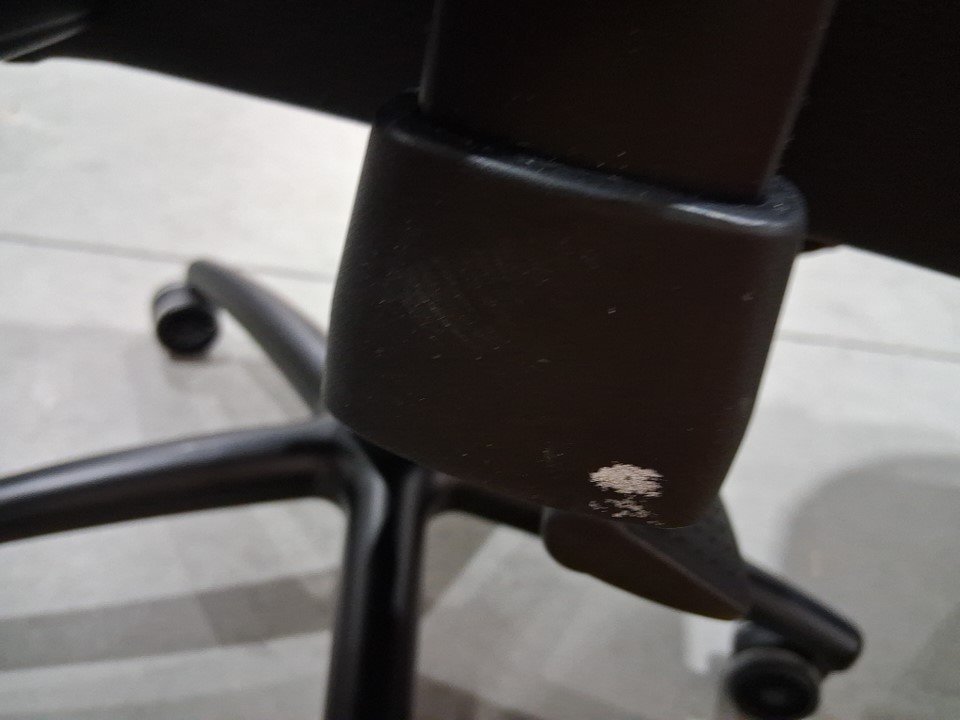 There is some dust and scuff marks on the bottom of the wheels from previous assembly. There is also some slight scuffs at the top of the product. Finally there is a white mark on the right side of the chair. See photos attached.