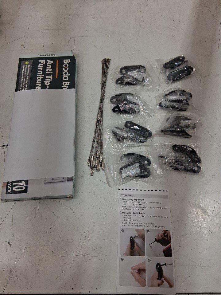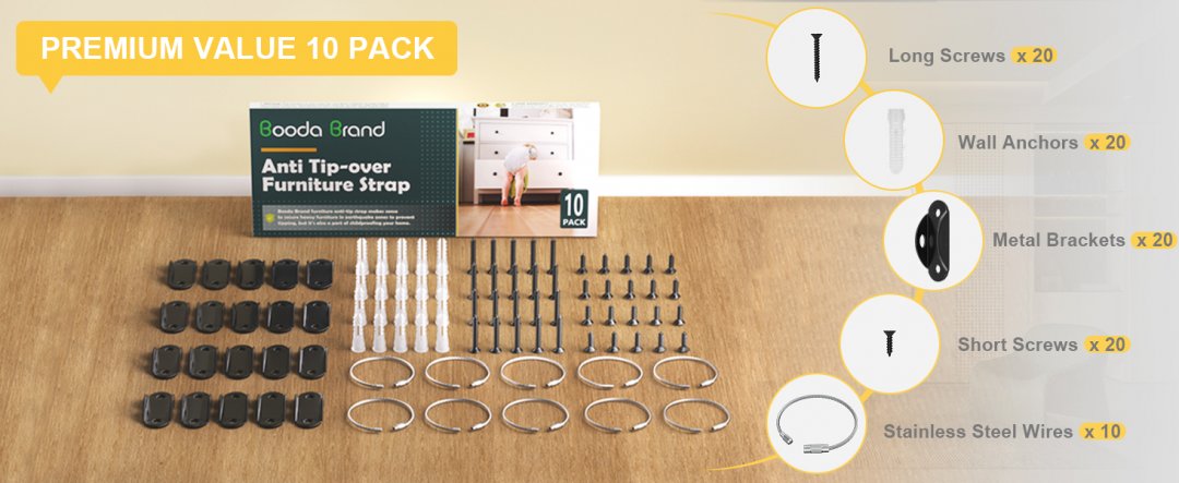 10pk Booda Brand Metal Furniture Anchors with Anti Tip Furniture Straps for Baby Proofing-400lbs max TENSION LIMIT (model:23FA)