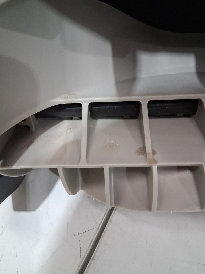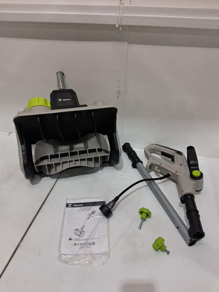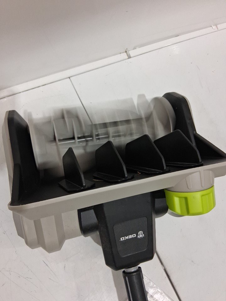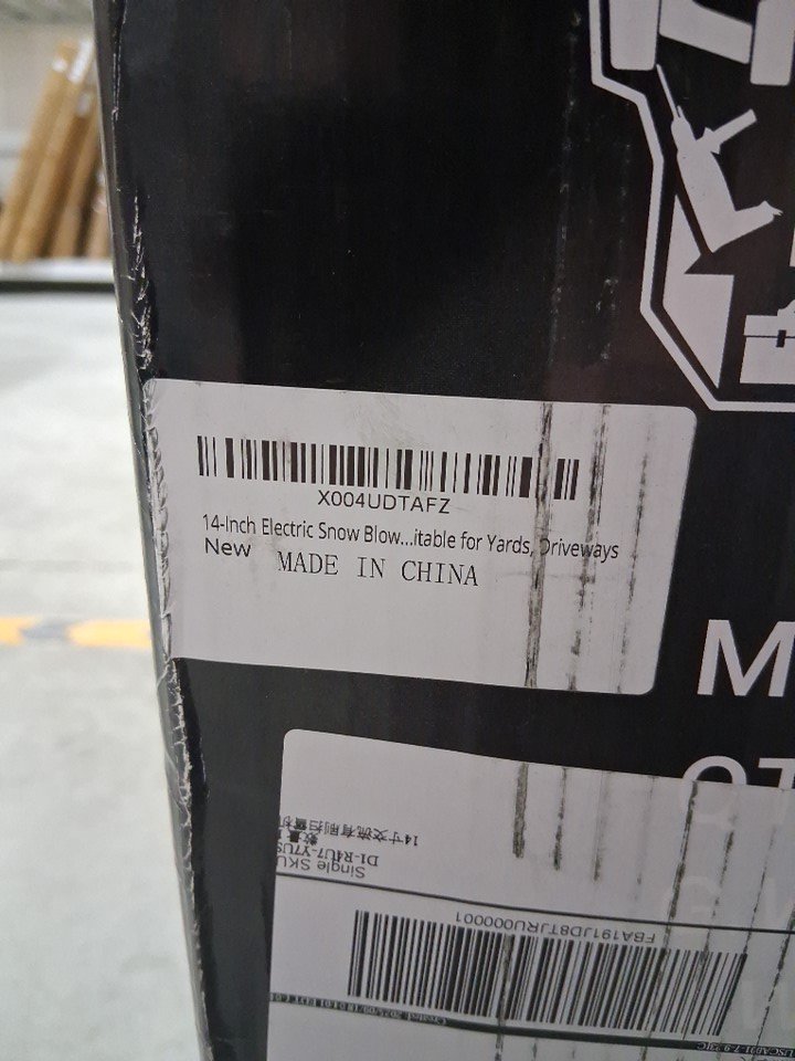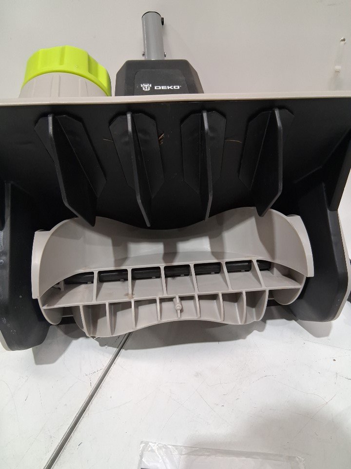 previous use indicated by the small bits of what appears to be salt buildup on the inside of the blades. Product also has an issue with responding to the turning knob for changing the direction in which the snow gets blown. The blades do not respond to the knob, but the blades do still work. See image details. Tested for power.