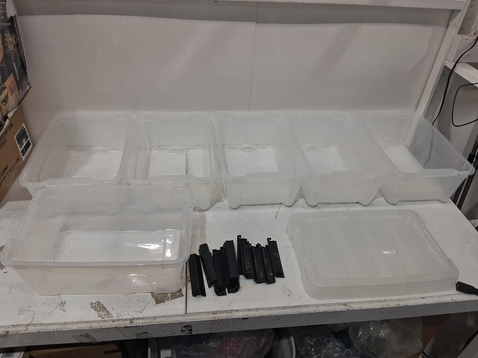 there are 6 bins total, one has a broken corner. 3 lids are missing along with one latch piece ( see photos)