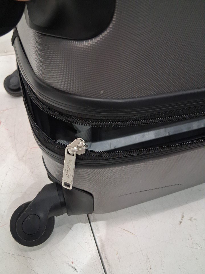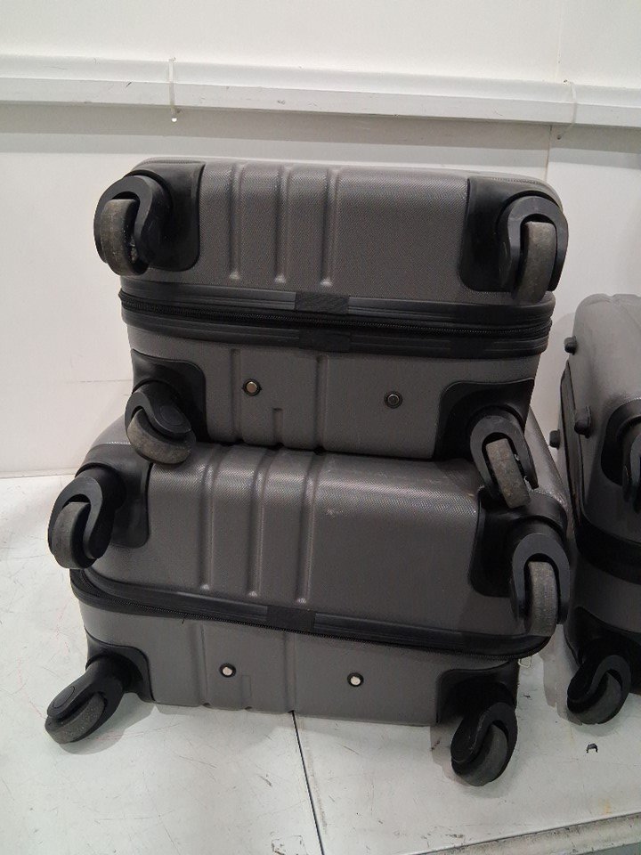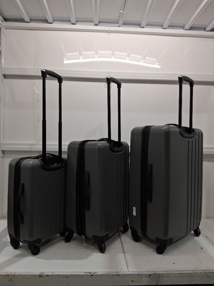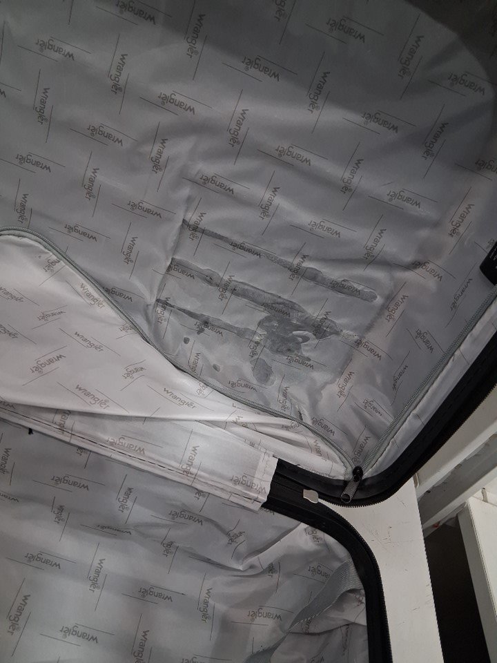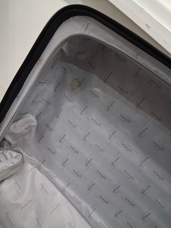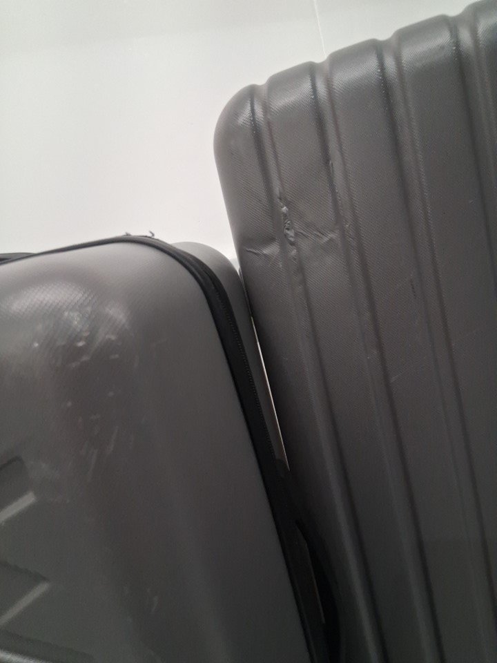 The zipper on the 24" suitcase is broken and will not close. There are dents/scrapes and damage on the outside, and staining/residue on the inside of all 3 suitcases from prior use. See photos.