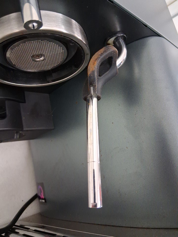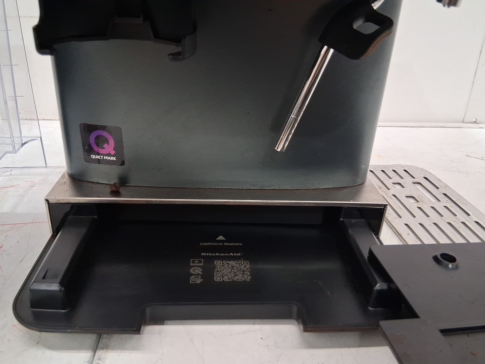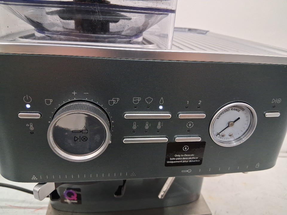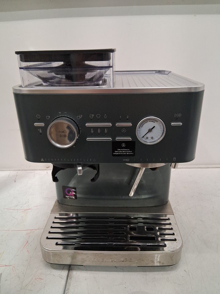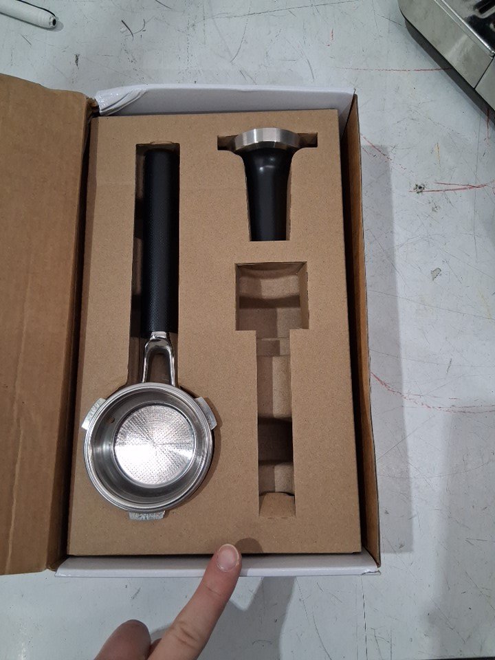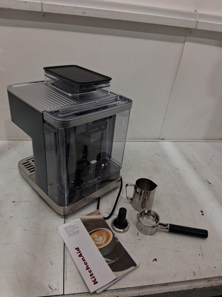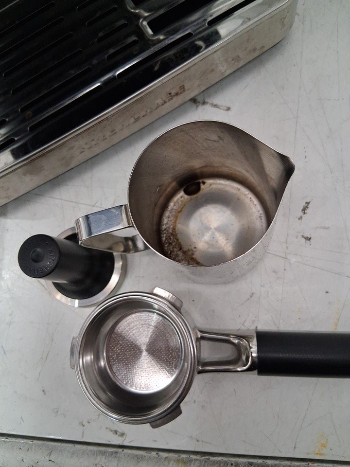 Missing one of the accessories. There is coffee residue in and on all parts of the item and water residue in the tank. Tested for basic power only.