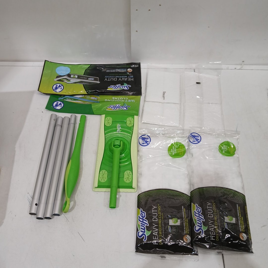 Swiffer mop appears assembled (scuffs from assembly) but everything else appears untouched.