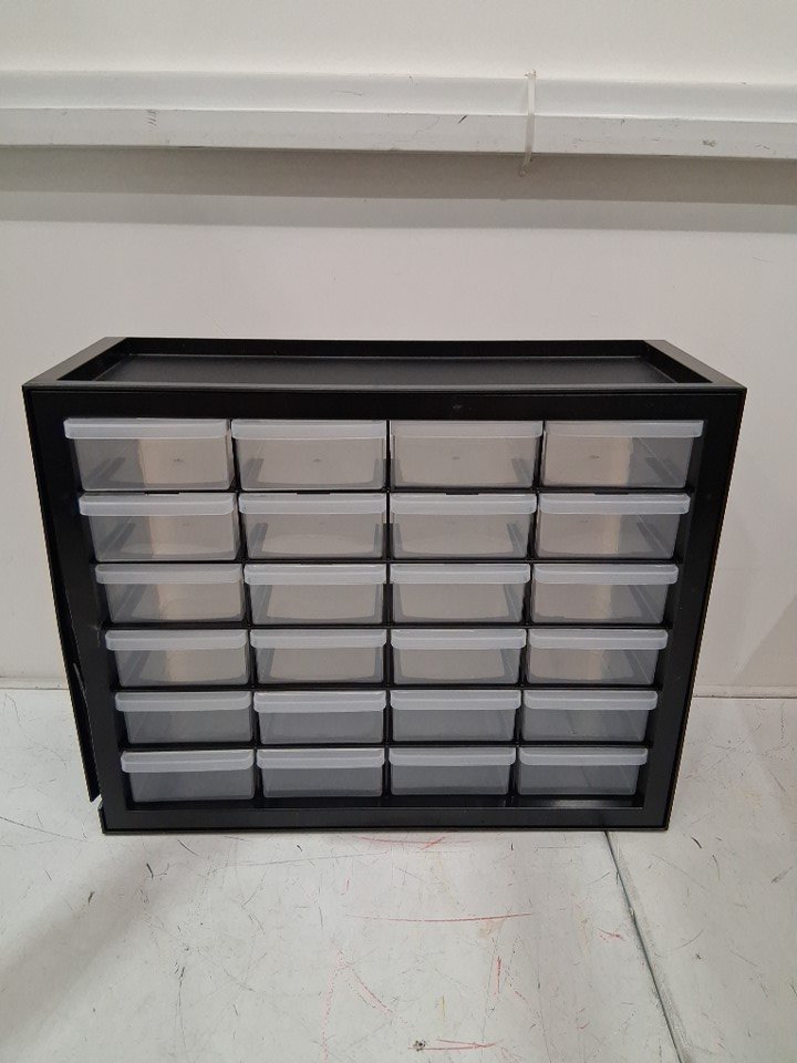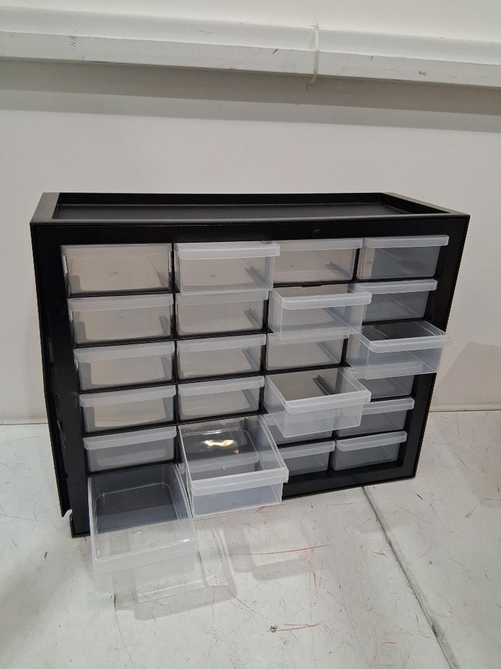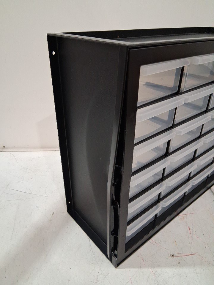 Damage on the left side of the item. The drawers still open/close with no issue. See photos.