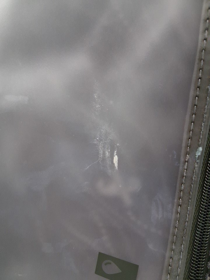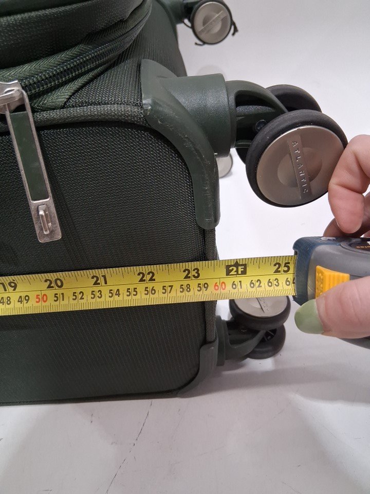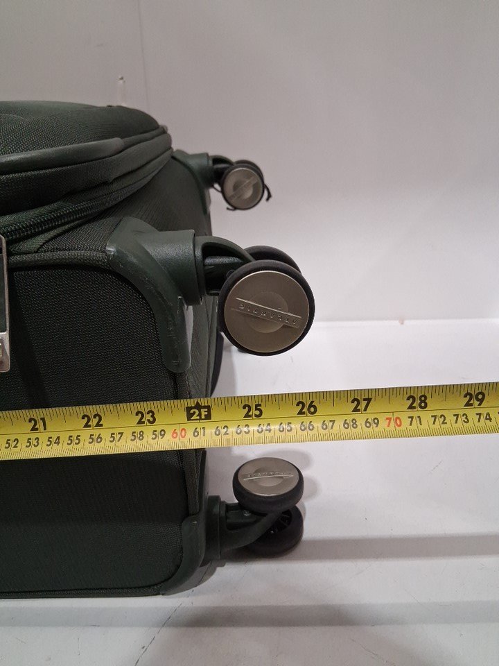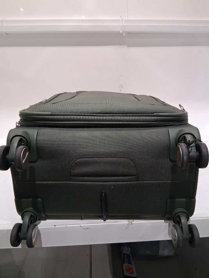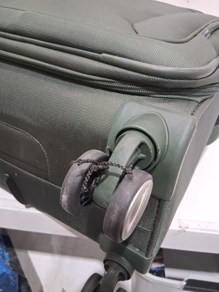 Light use indicated by the dirt/debris on the wheel as well as a small rope that appears to be caught in one of the wheels - it does not affect the wheel from performing. As well as, a dark stain on the side of the suitcase, and lastly a small mark on the inside of the suitcase on the plastic compartment. See image details.