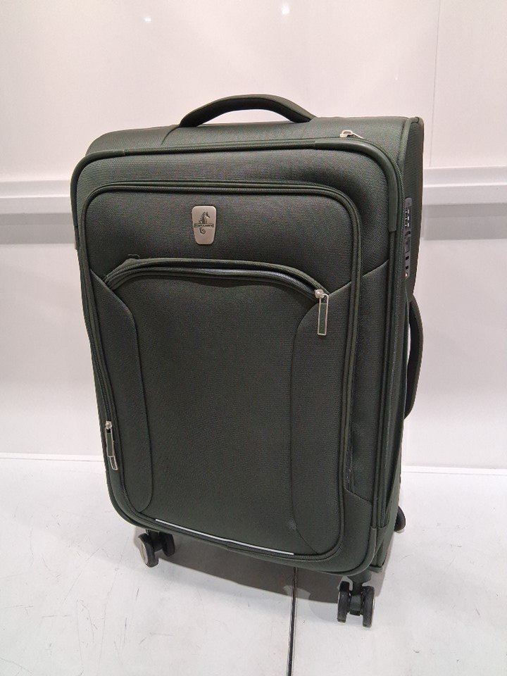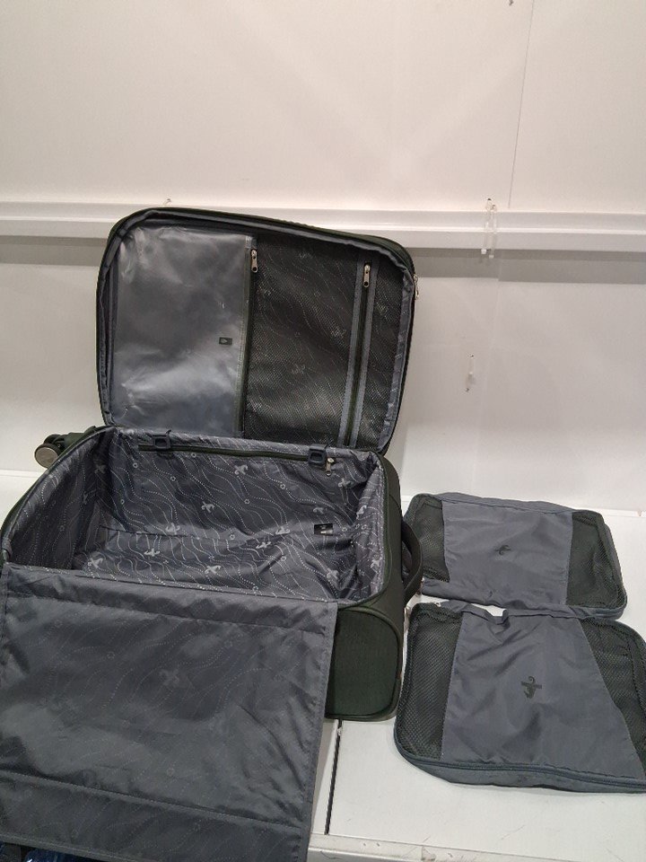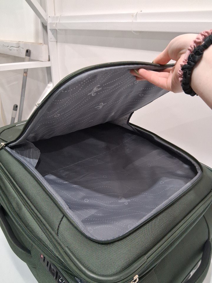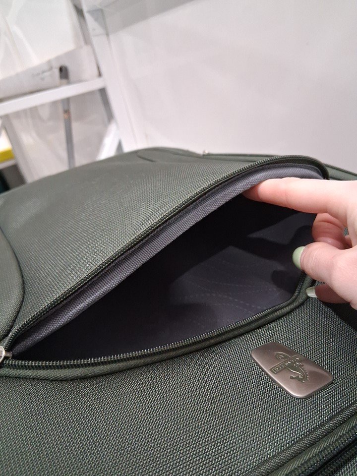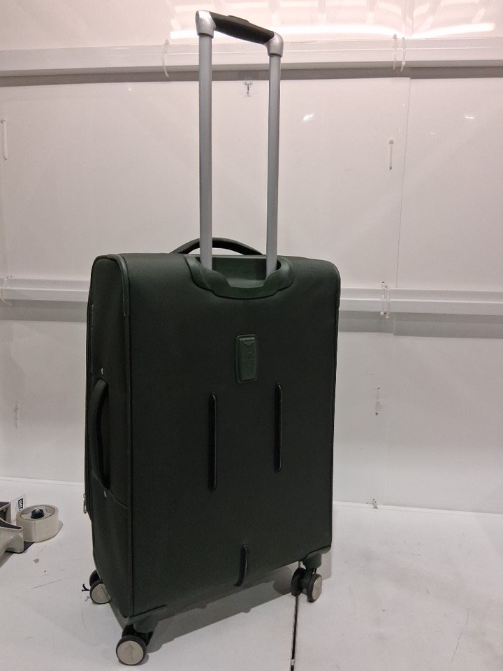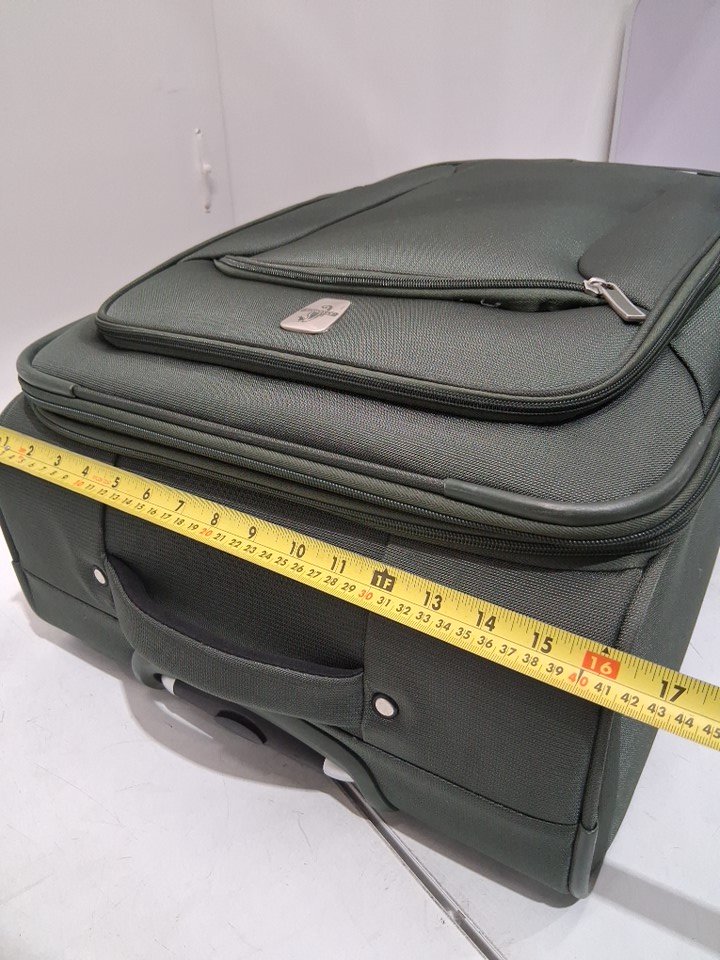 Light use indicated by the dirt/debris on the wheel as well as a small rope that appears to be caught in one of the wheels - it does not affect the wheel from performing. As well as, a dark stain on the side of the suitcase, and lastly a small mark on the inside of the suitcase on the plastic compartment. See image details.