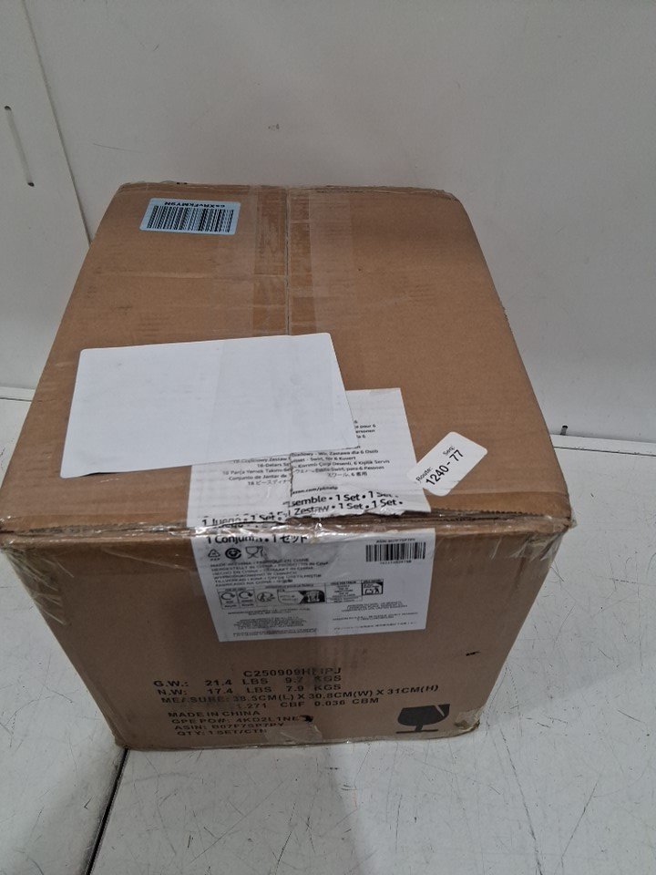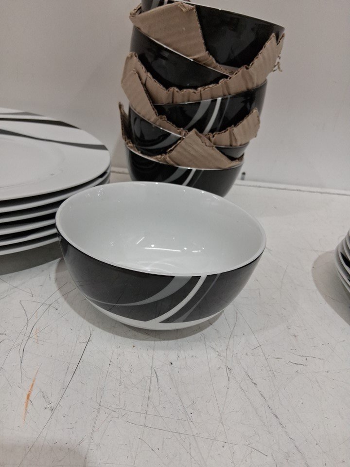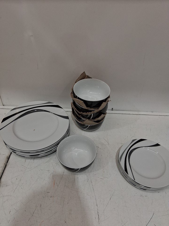 18PC Amazon Basics Dinnerware Set, Plates, Dishes, Bowls, Service for 6 - Swirl (MODEL: 80534)