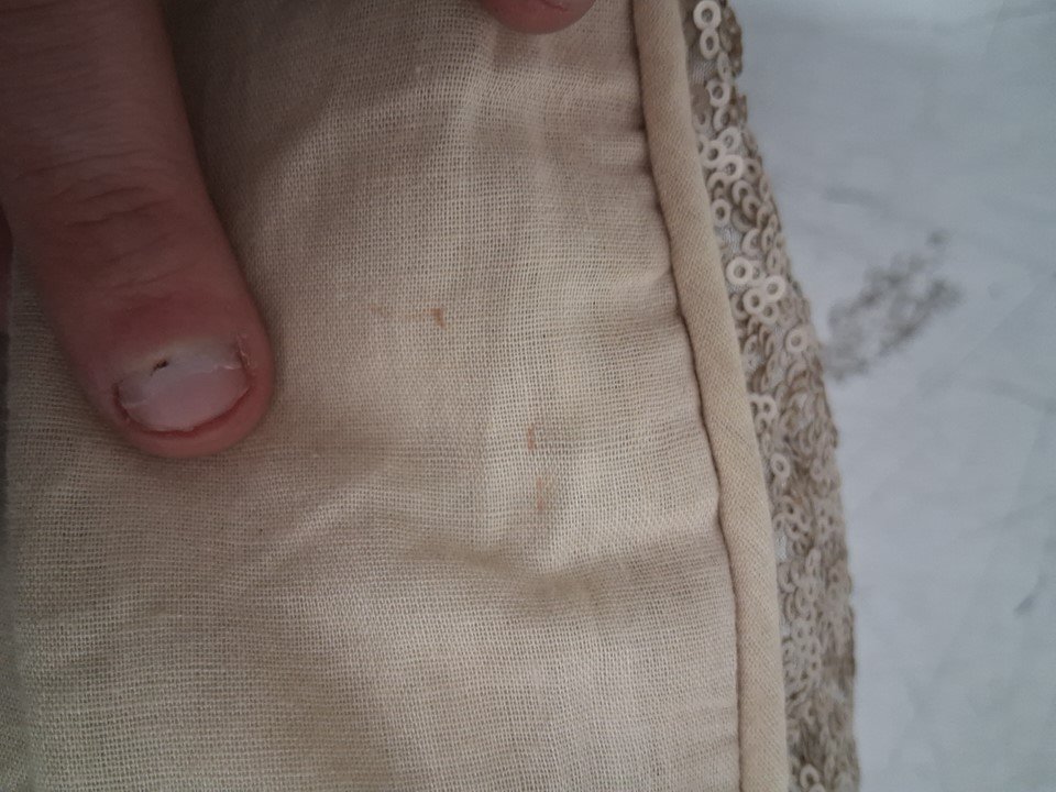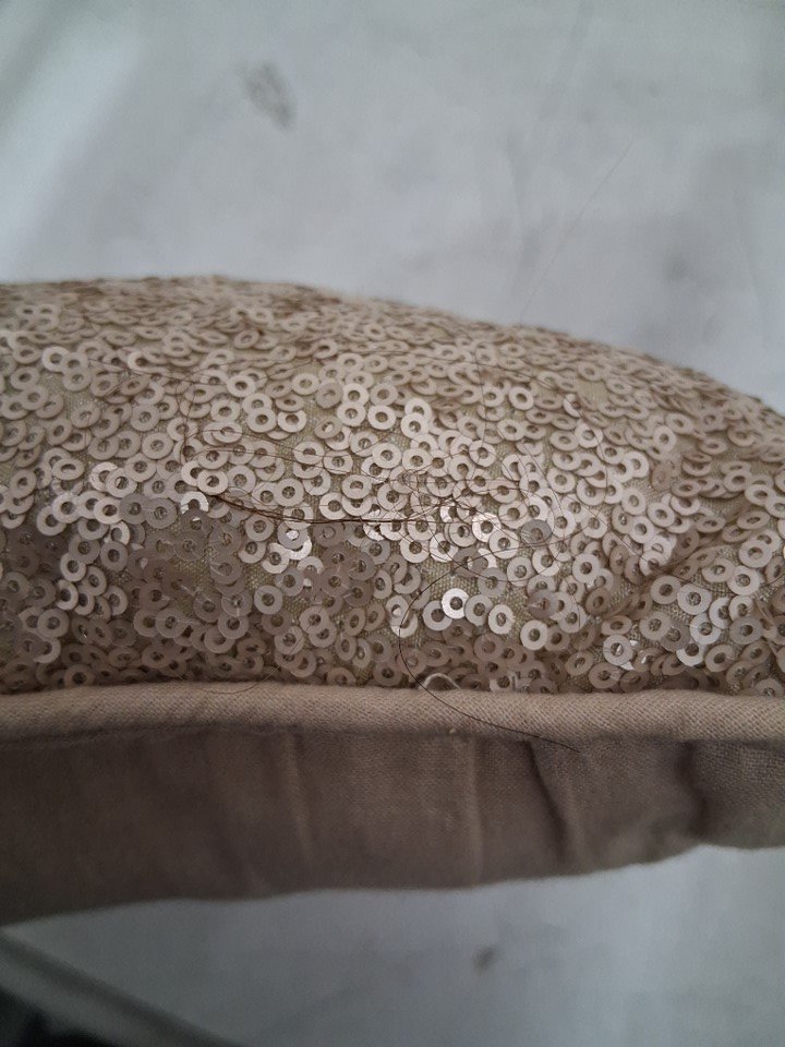 The small pillow with sparkles had some hair on it and a couple very small stains on the back of it, and the square pillow has a streak mark which seems to be from a thread that was pulled out. (Please see photos)