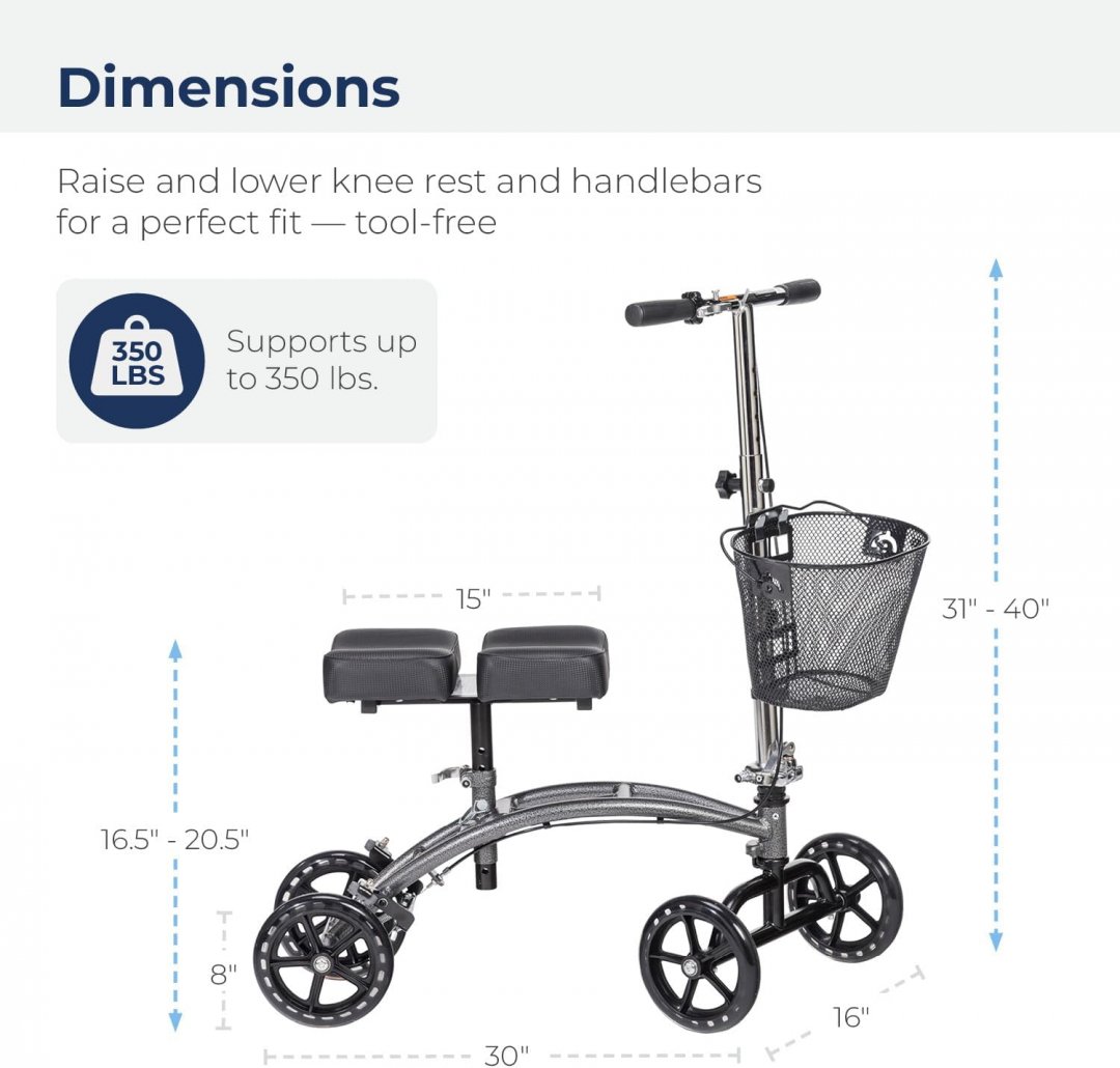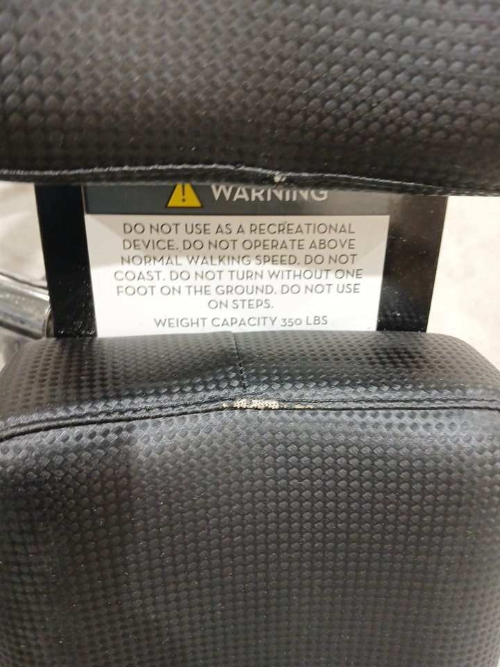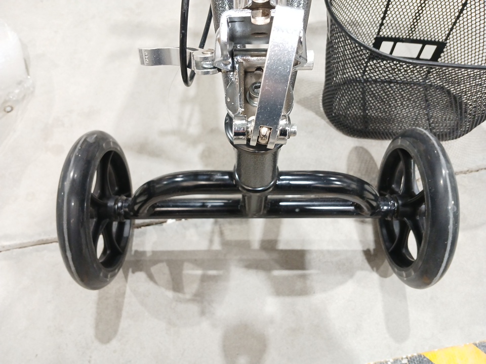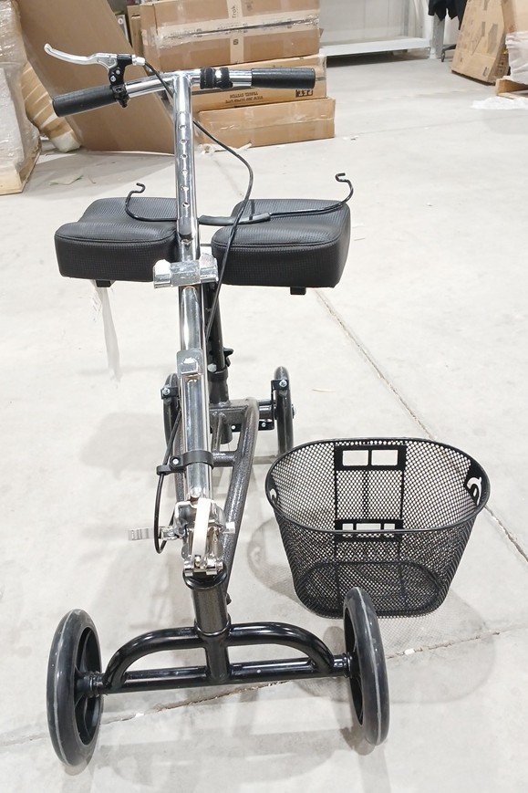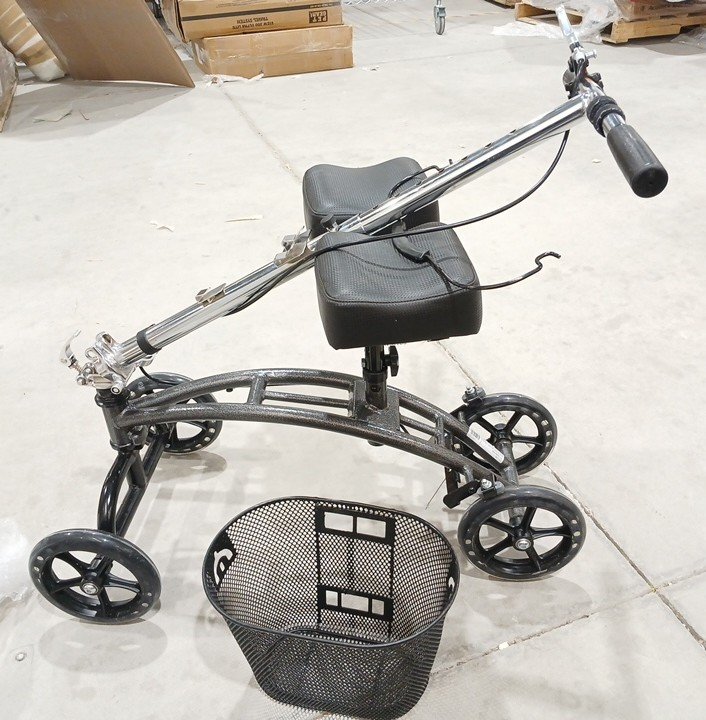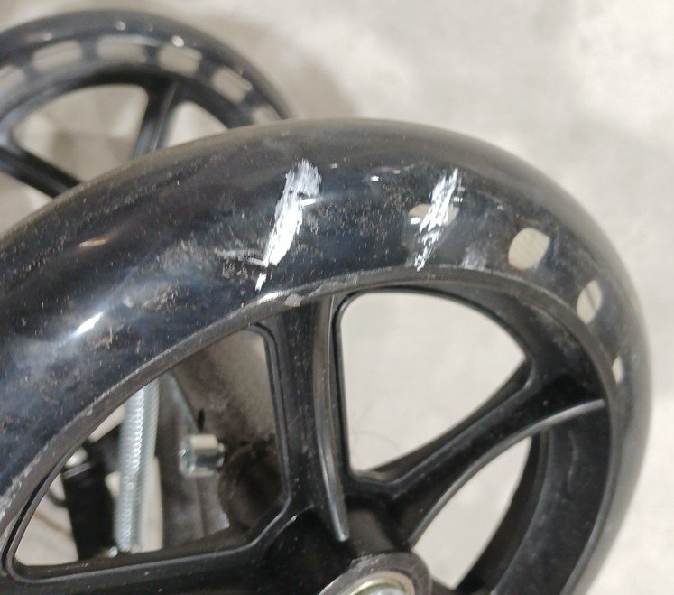 NOTE: we were unable to get the item to stand on its own; it needs repairs before it can be used. The plastic knob is broken, the wheels have white scuffs, the seat has some tears on its edges, and the wheels are a little dirty