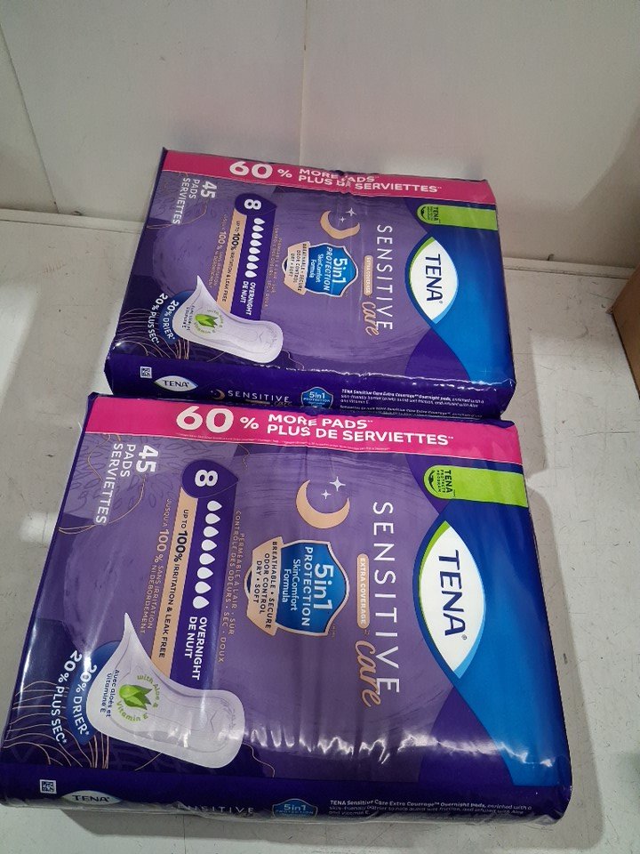 2PK TENA SENSITIVE CARE OVERNIGHT EXTRA COVERAGE PADS - 90 total - white (model: 054309 v-04)