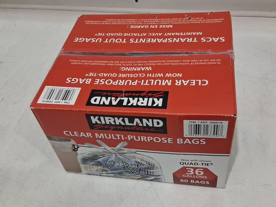 60pk kirkland signature quad tie multi purpose garbage bag - 36gal - clear (model:295619)