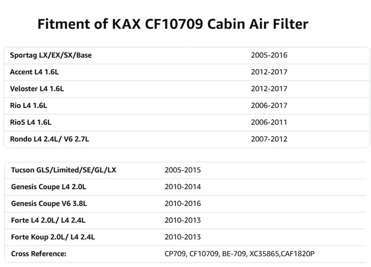 Fitments of Cabin Air Filter: Sportag LX/EX/SX/Base -2005-2016 Accent L4 1.6L -2012-2017 Veloster L4 1.6L - 2012-2017 Rio L4 1.6L - 2006-2017 Rio5 L4 1.6L - 2006-2011 Rondo L4 2.4L/ V6 2.7L - 2007-2012 Tucson GLS/Limited/SE/GL/LX - 2005-2015 Genesis Coupe L4 2.0L - 2010-2014 Genesis Coupe V6 3.8L - 2010-2016 Forte L4 2.0L/ L4 2.4L - 2010-2013 Forte Koup 2.0L/ L4 2.4L - 2010-2013