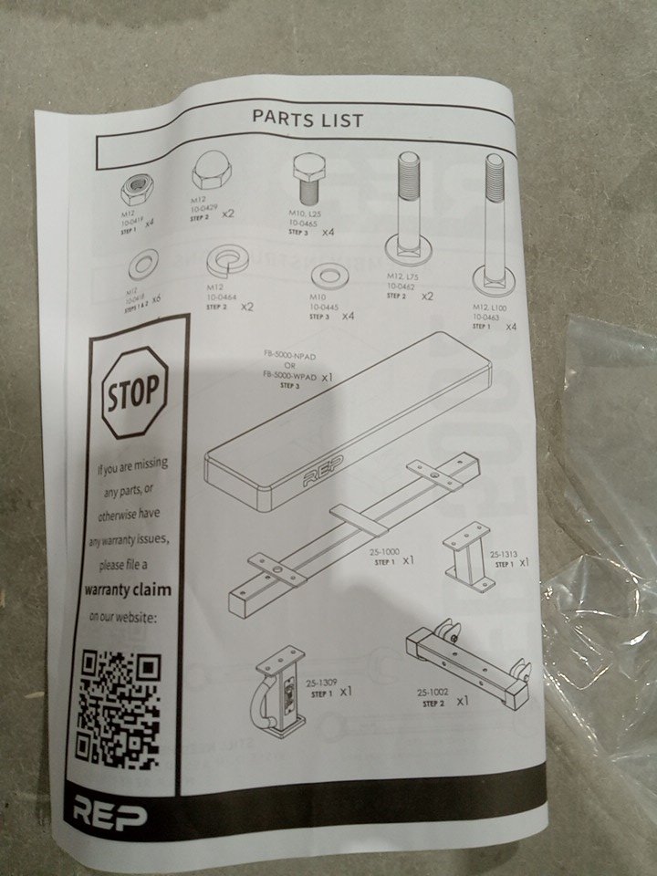 upon inspection, we have found that all contents inside are in brand new condition, however the main pad piece is missing seemingly due to shipping and handling, this will cause issue with assembly and with usage as you will not have the main pad to use. the pad piece then it could be applied to this bench so this item can be used, but as is the vital parts for usage are missing. we have found that the missing piece is available to order online, we recommend obtaining this piece so that this item can be fully assembled and used for its intended purposes. (LINK: https://www.fitness-superstore.co.uk/rep-fb-5000-wide-pad.html?srsltid=AfmBOopgw8v2G5MJtZ_QoiFDW-1vUHgvk1LFGbBvHYAq5T0FjWE0xz6Z) see photos below.