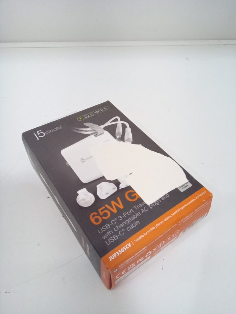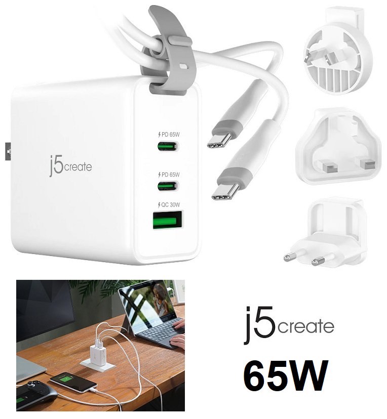 J5create 65W Triple Port GaN Travel Power Adapter Set with Changeable Plugs and USB-C Cable - White (Model: JUP3565CV)