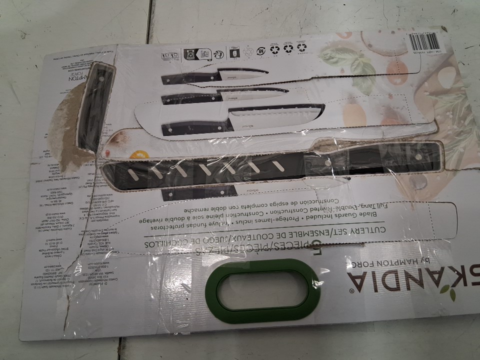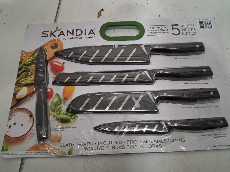 5PC Skandia by Hampton Forge German Steele Knife Set with Blade Guards/Sheathes - Chef, Bread, Santoku, Utility, and Paring - Black (Model: 1938125)
