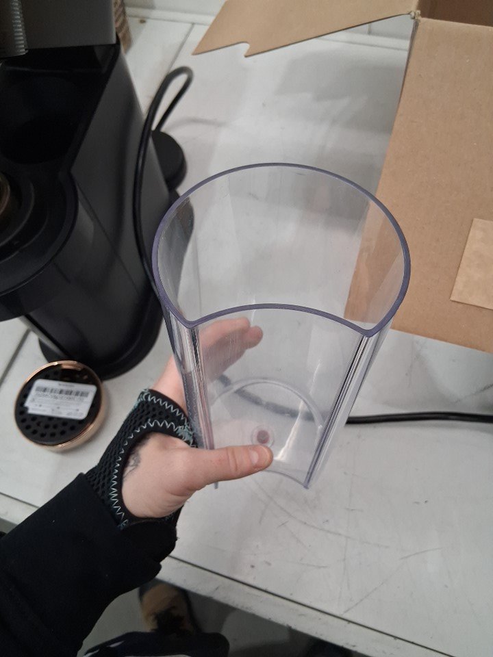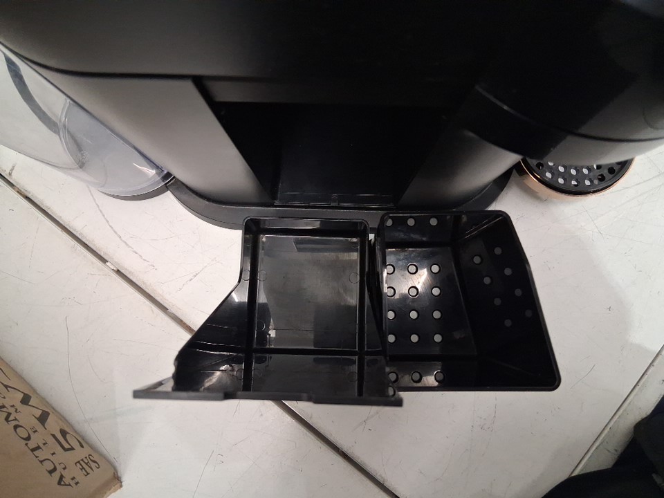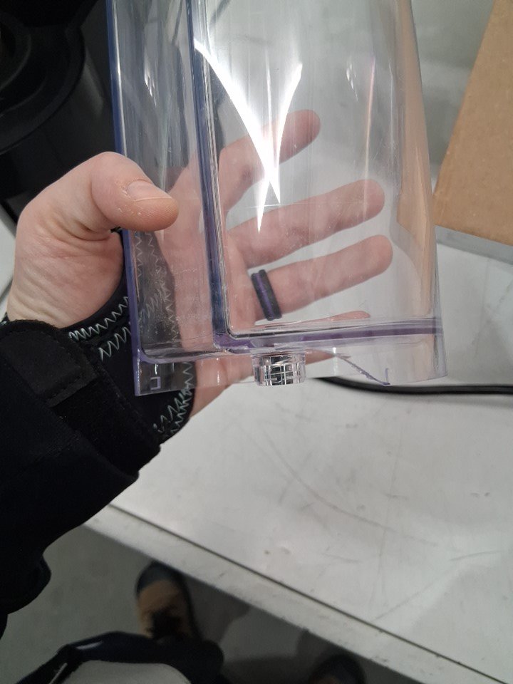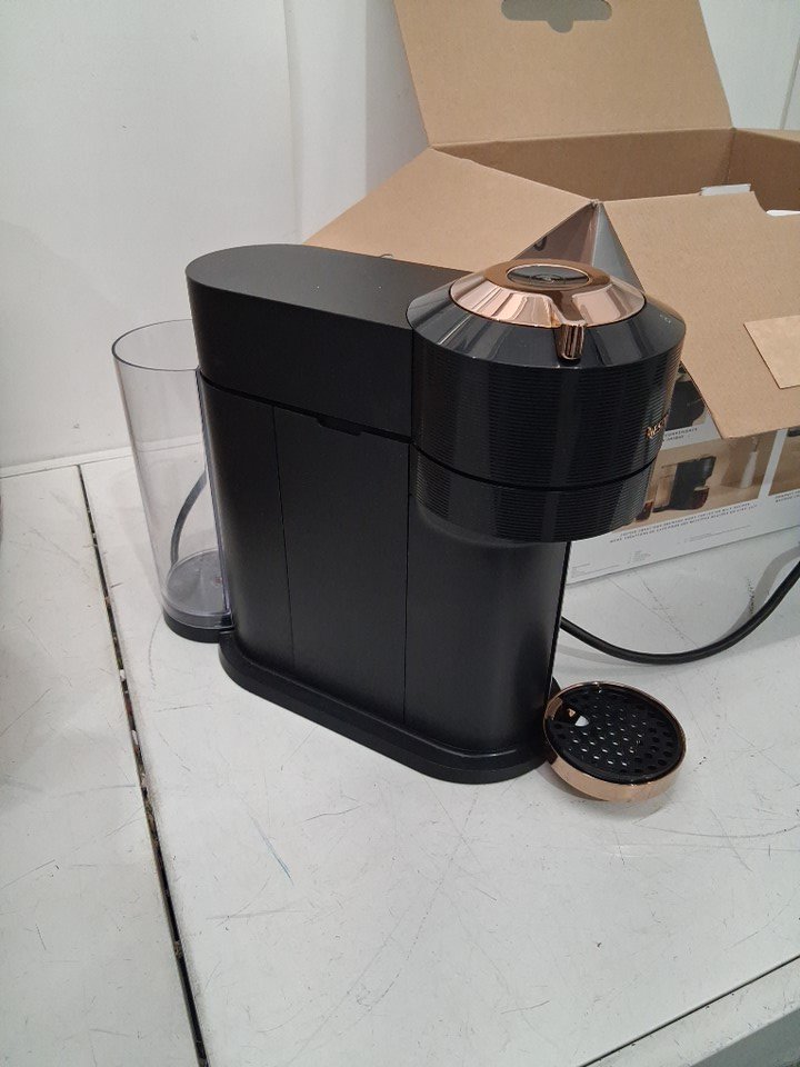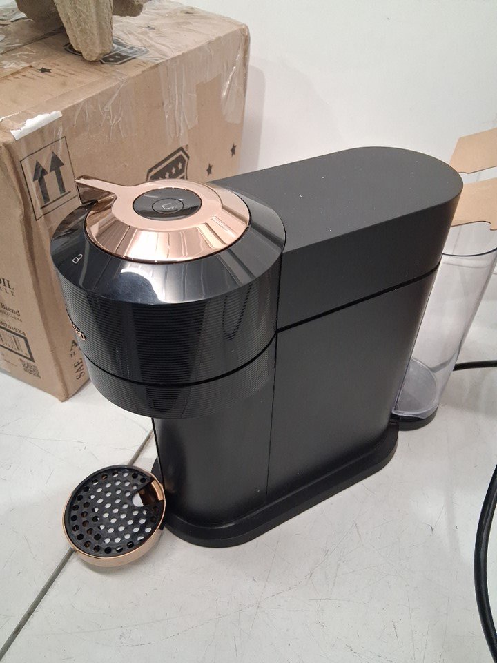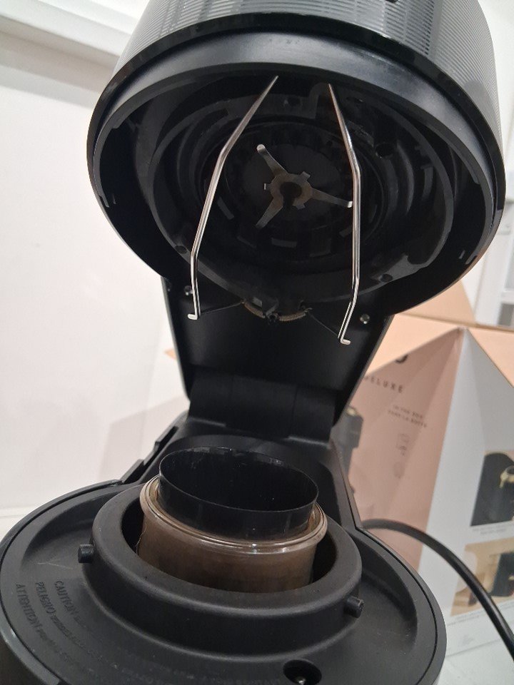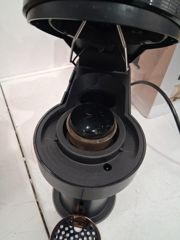 machine has signs of use, coffee stains in cartridge catcher and inside cartridge insert. Water cannister has a chuck of plastic broken off bottom edge (still usable not through bottom) and lid is missing, water cannister is replaceable. Has been tested for power only