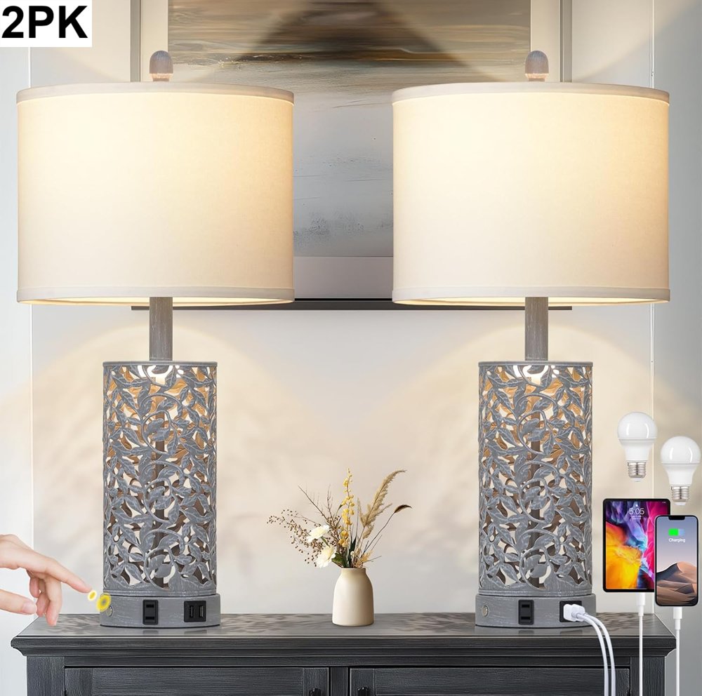 2PK Cinkeda Vintage Lamp with 2 USB Ports, an AC Outlet, & Touch Control - e26 bulb - 12.6" x 12.6" x 24.5" - GREY (model: TD-CK-342)