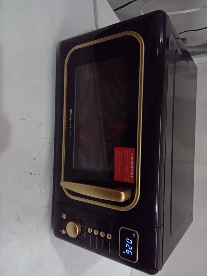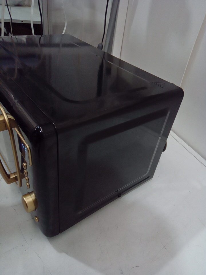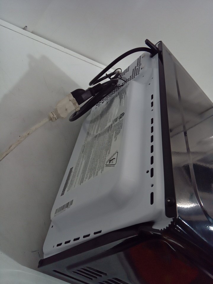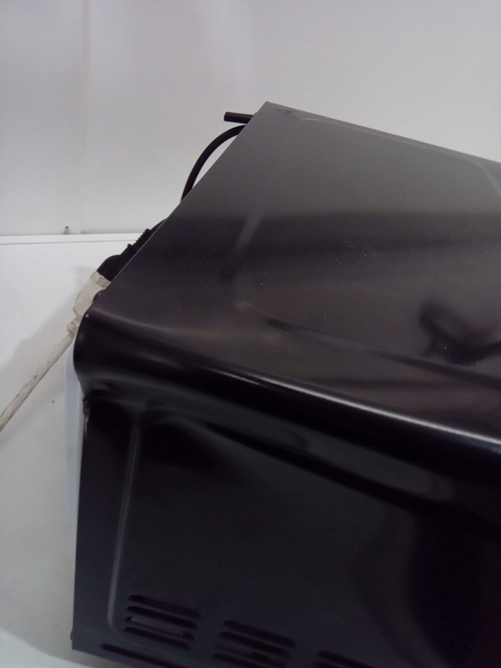 tested for power. appears to be missing the plate and the ring. please note that there is food stains on the inside and a small dent on the left back side (See photo)