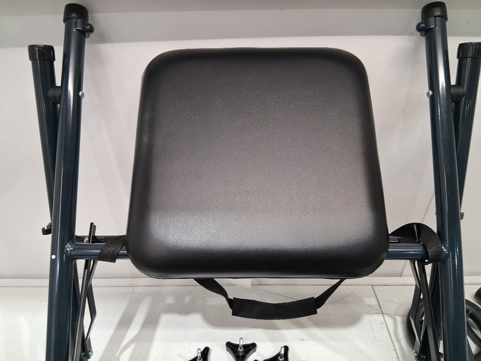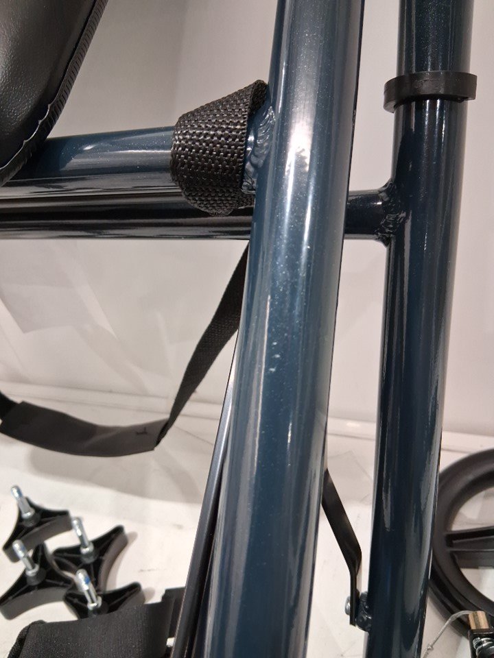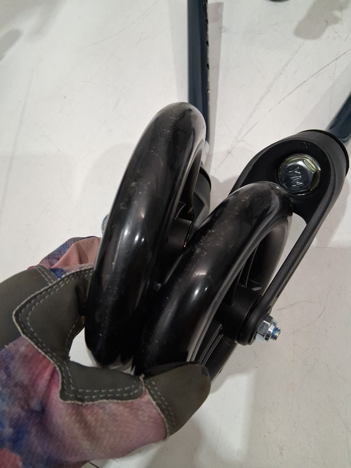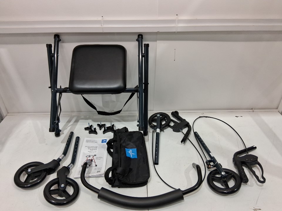 Item shows signs of light use. There are minor scuffs and scratches present throughout. There are also minor indents to the back rest piece and minor dirt present on the wheels and inside the attachable storage bag (see photos).
