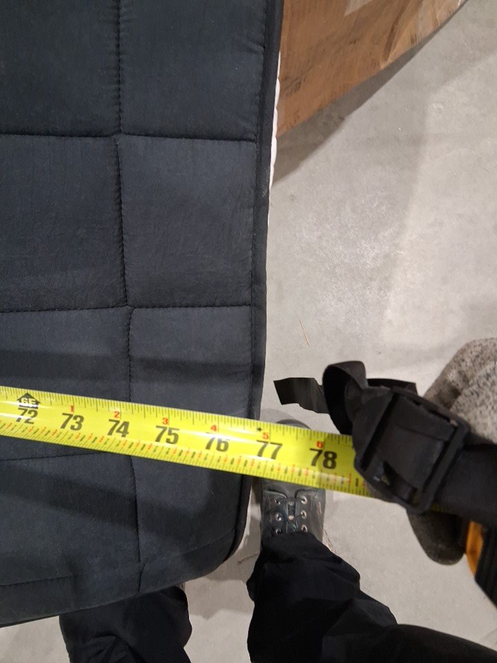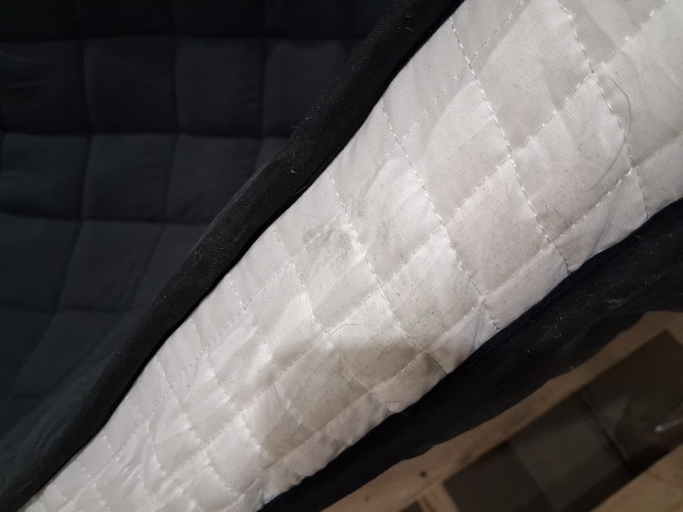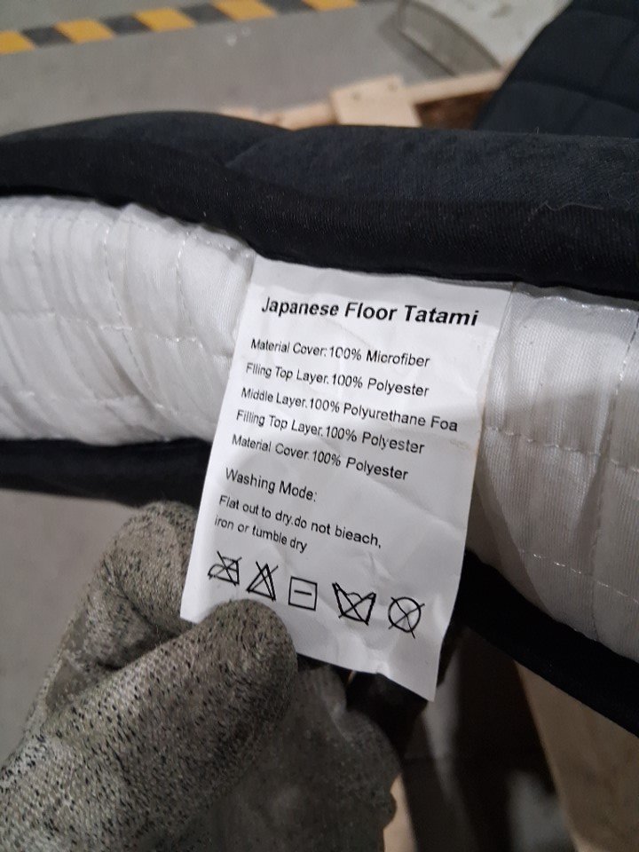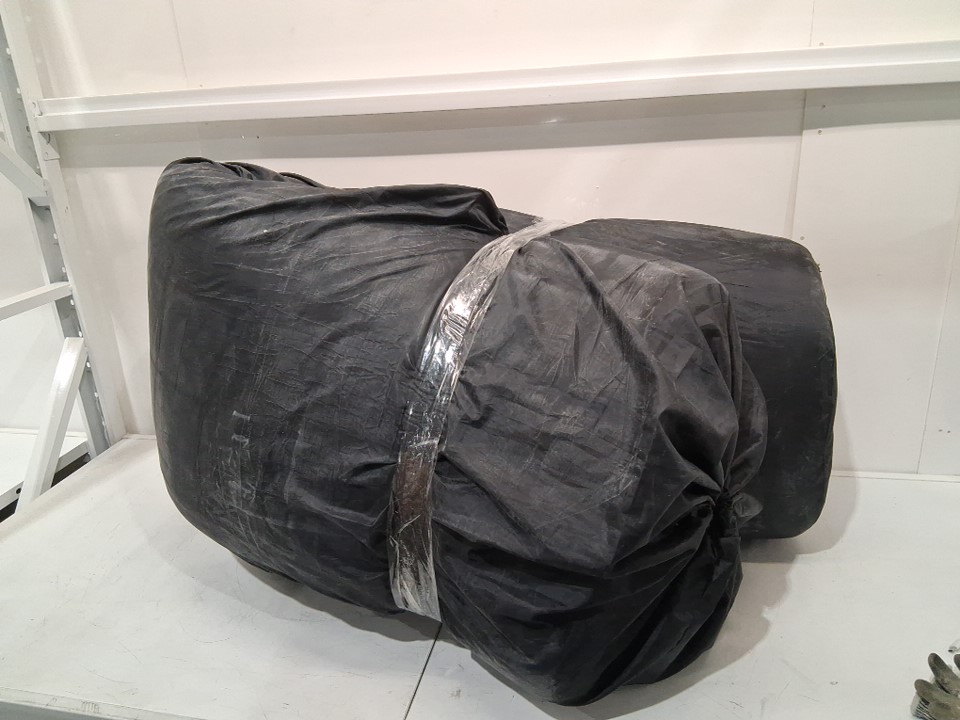 Storage bag distressed, dirt and debris on one edge of mat and storage bag due to warehouse conditions.