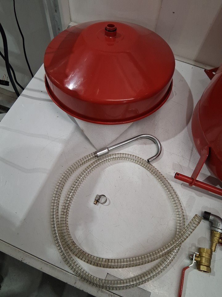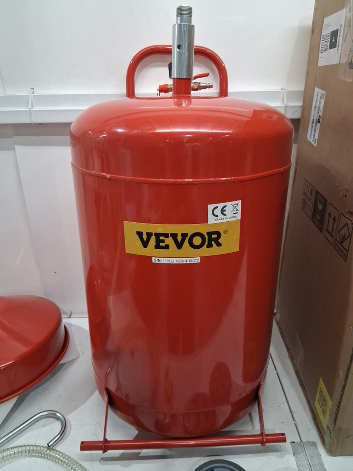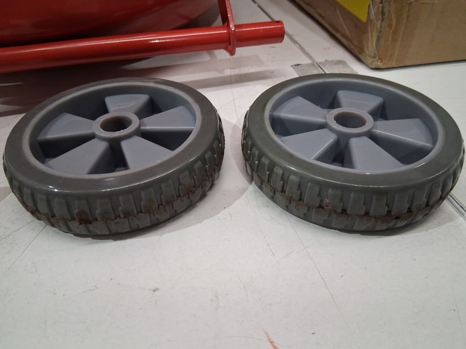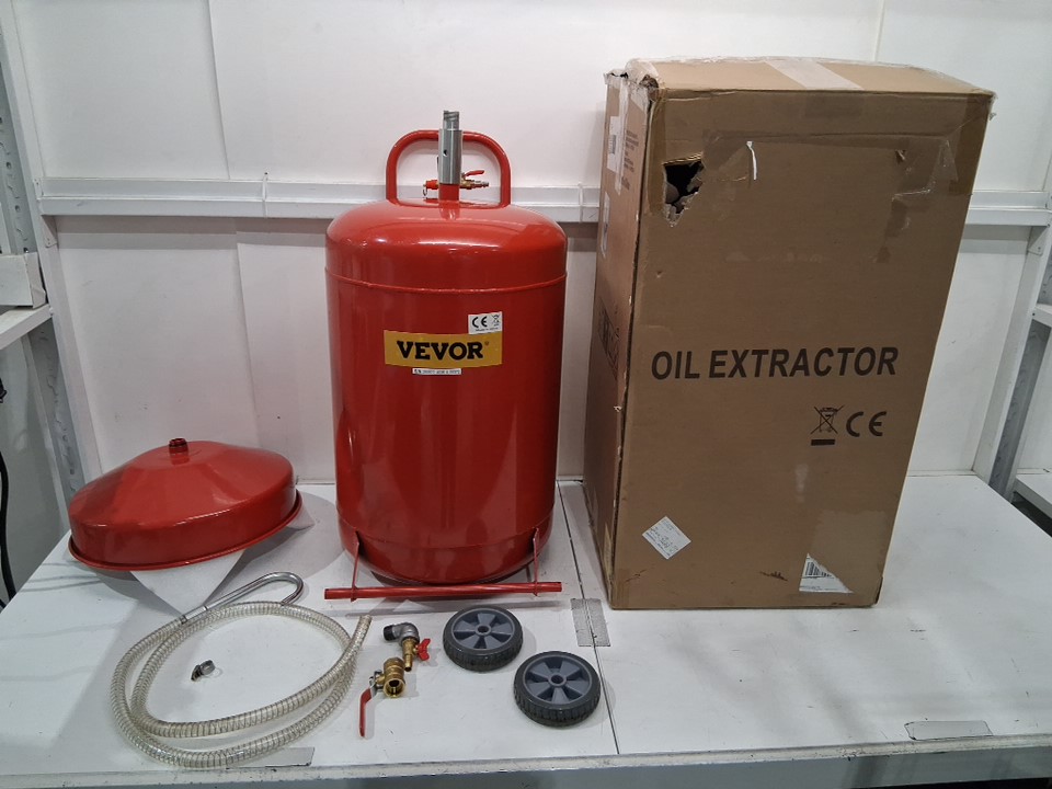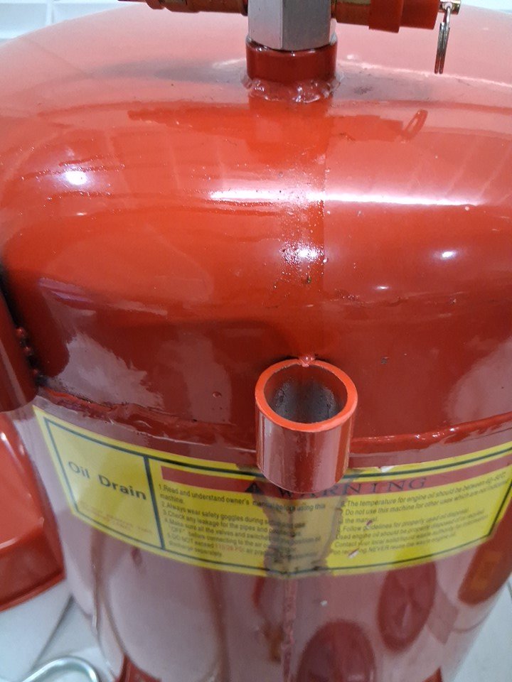 There is oil on the container indicating previous use. Please note that the threads on the top spout are damaged and the hardware for the wheels and the manual are not included (see photos)