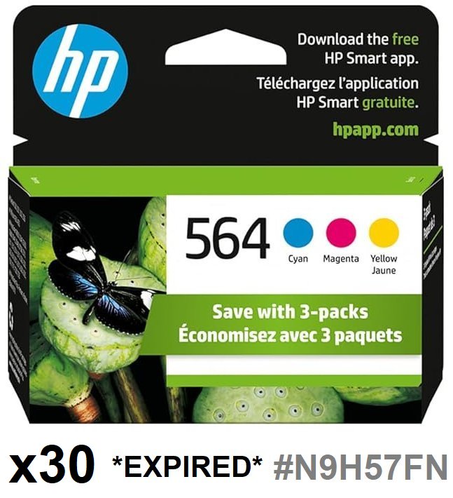 30 *EXPIRED* HP 564 Colour Ink Cartridges for Select DeskJet, OfficeJet, and PhotoSmart Printers - Cyan, Magenta, Yellow (Model: N9H57FN)
