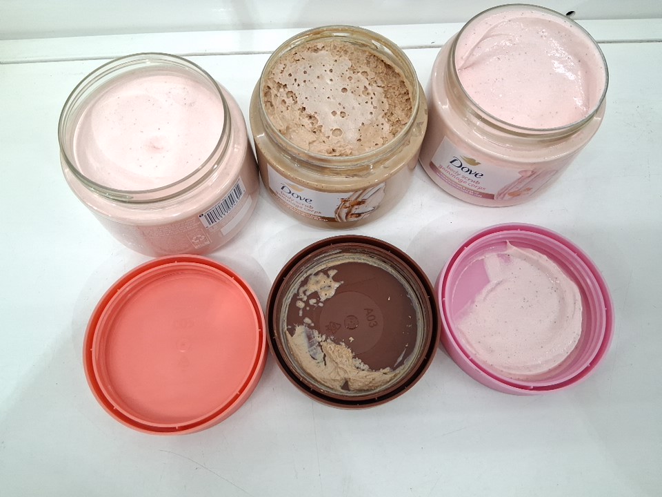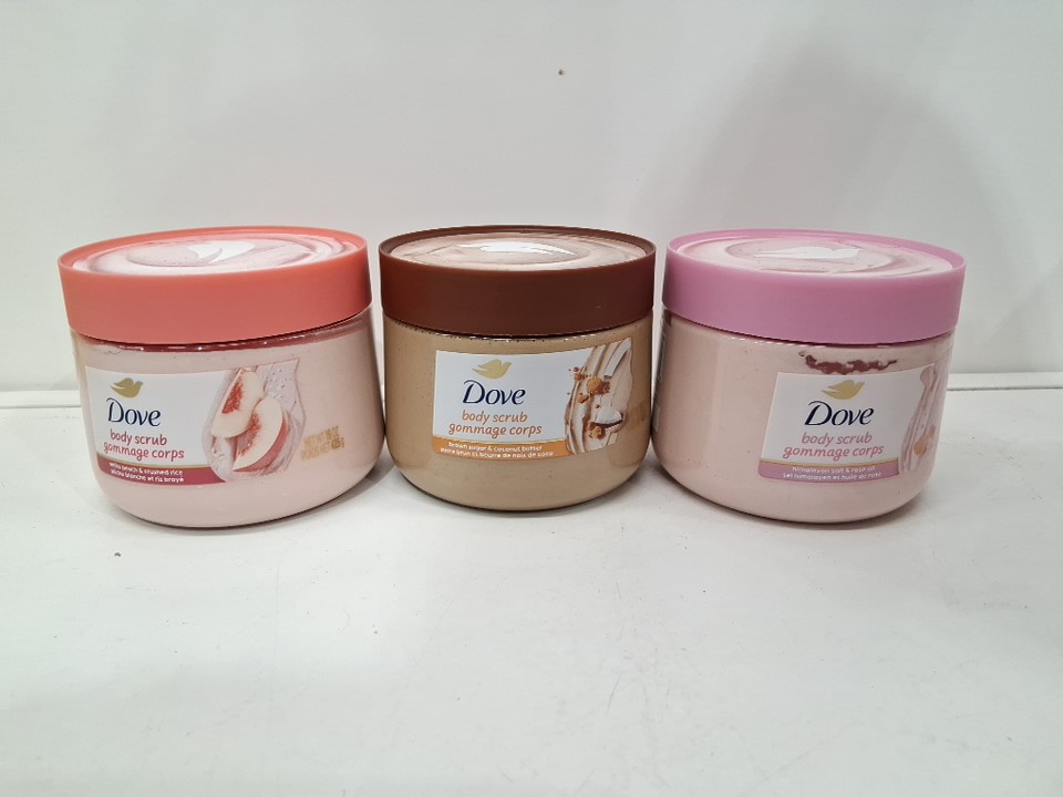 3pc DOVE BODY SCRUBS - 425G EACH - himalayan salt & rose oil/ brown sugar & coconut butter/ WHITE PEACH & CRUSHED RICE