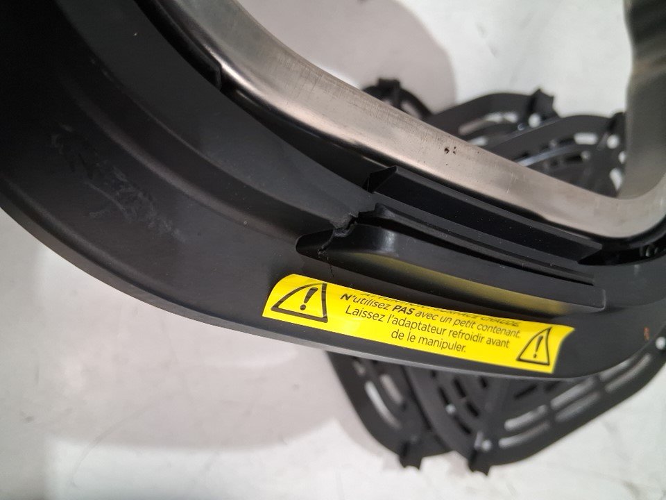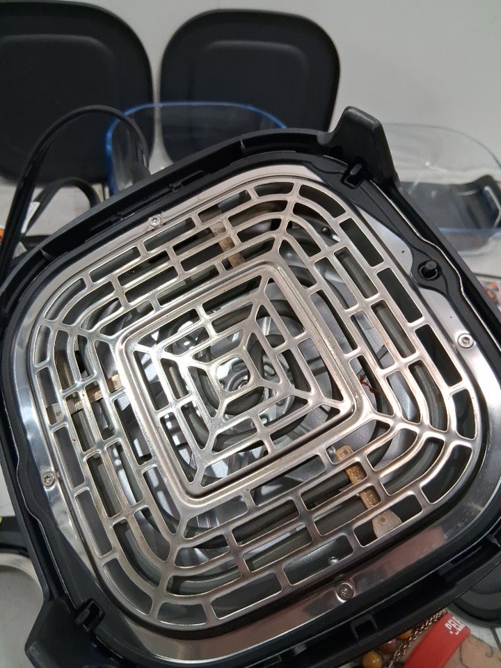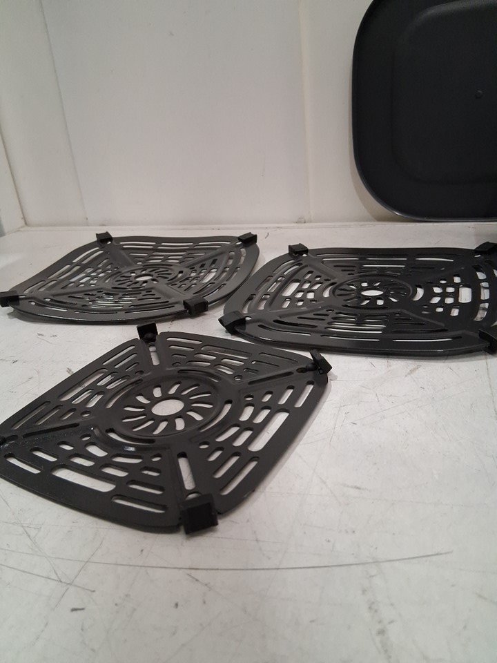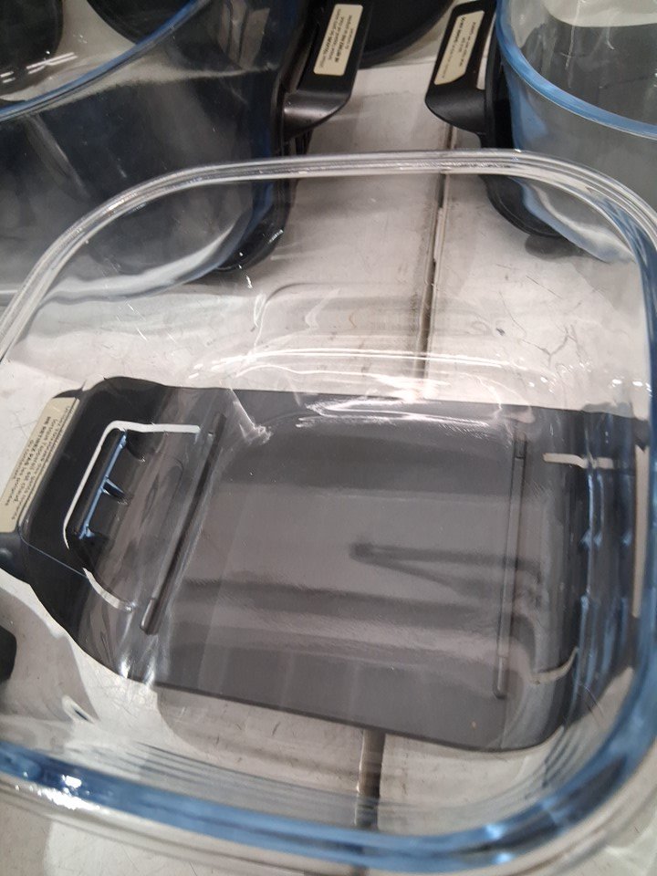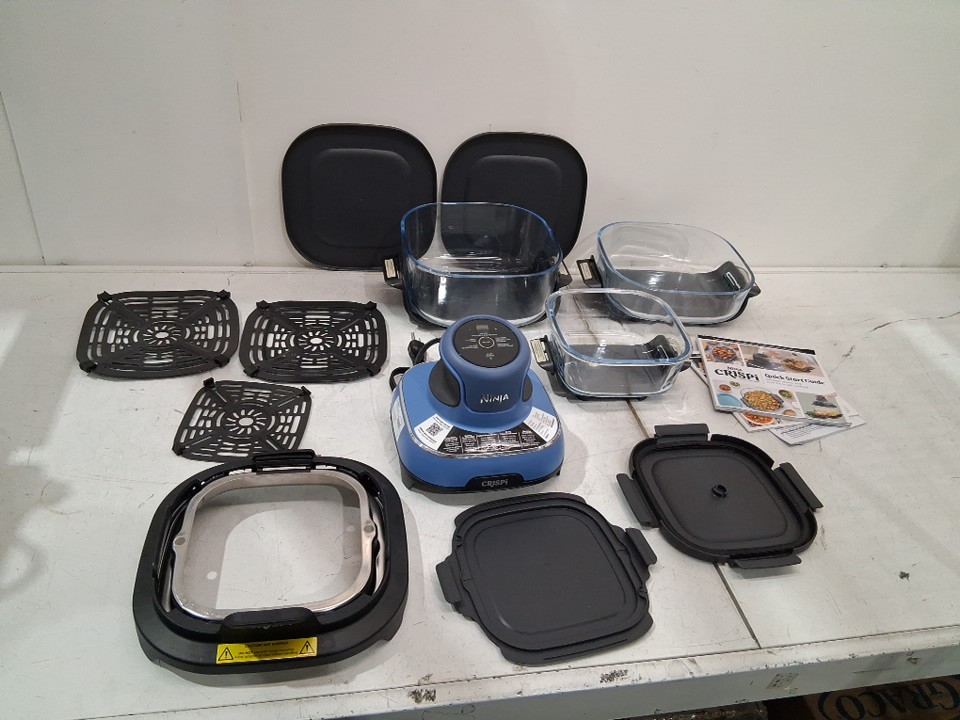 please note item has some food residue in glass containers as well as under cooking head from previous use please also note that metal inserts have s light bend from shipping and the cooking head has a crack in in it and the large head attachment has a spring column broken but was tested for basic power