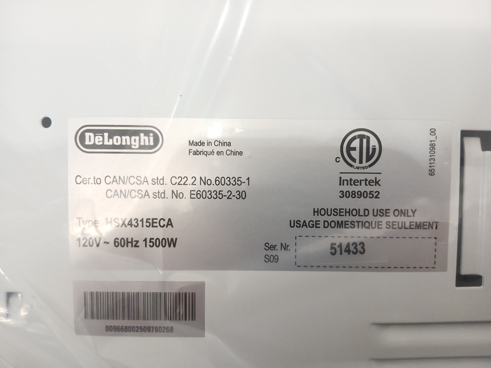 DELONGHI HSX SLIM STYLE DIGITAL CONVECTION WALL/FLOOR PANEL SPACE HEATER - 1500W - WHITE - (MODEL: HSX4315Eca)