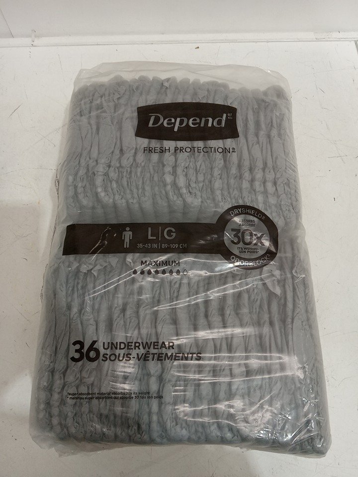 36PK MEN'S DEPEND FIT-FLEX DISPOSABLE INCONTINENCE UNDERWEAR - MAXIMUM ABSORBENCY - LARGE - GREY