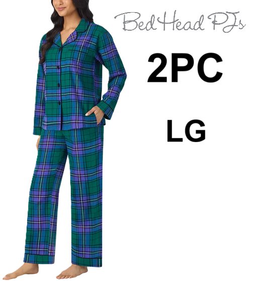2PC Women's BedHead Cotton Pajamas - Large - Blue/Green Plaid (Style: 4323332)