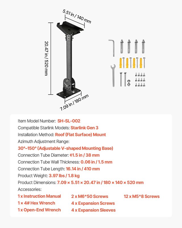 heavy duty starlink gen 3 roof mount with 30-150° adjustable angle Mounting Roof Pole Adapter pipe kit - black (model: sh-sl-002)