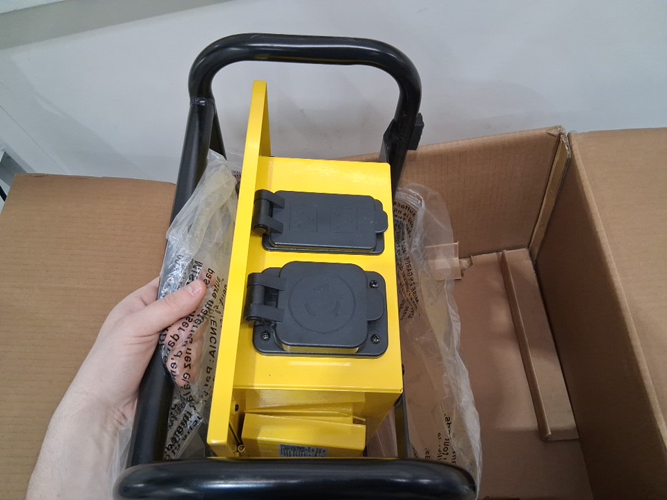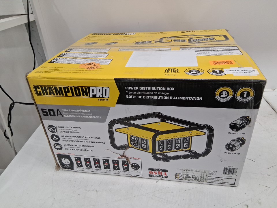 Champion Power Equipment Pro Grade OSHA Compliant Power Distribution Box, 50A Twist Lock Inlet, 6x 120V GFCI Duplexes, 1x 120/240V 30A Locking Outlet, 30A & 50A RV Adapters - yellow/black (model: 201174)