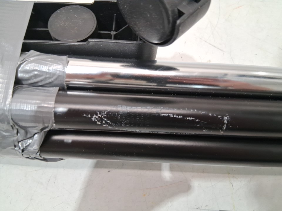 item has some cosmetic dents and markings in silver poles, and duck tape stuck to poles leaving duck tape residue on poles (see photos)