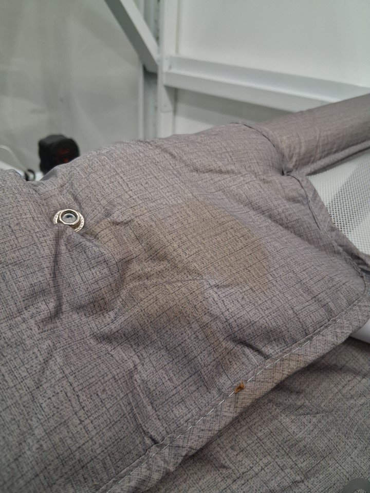 item has some yellow stains on the seat cover and dust present from prior use (see photos).