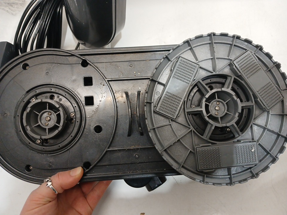 there is residue present due to use. missing one mop disc & the connecting base is damaged, but may be repairable