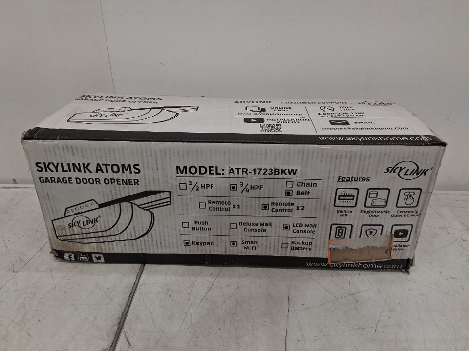 SKYLINK GARAGE DOOR OPENER WITH QUIET DC MOTOR, BELT DRIVE, BUILT-IN LED LIGHT, REMOTE CONTROLS, PREMIUM LCD WALL CONSOLE, WIRELESS KEYPAD AND WIFI COMPATIBLE - 3/4HPF - WHITE/BLACK (MODEL: ATR-1723BKW)